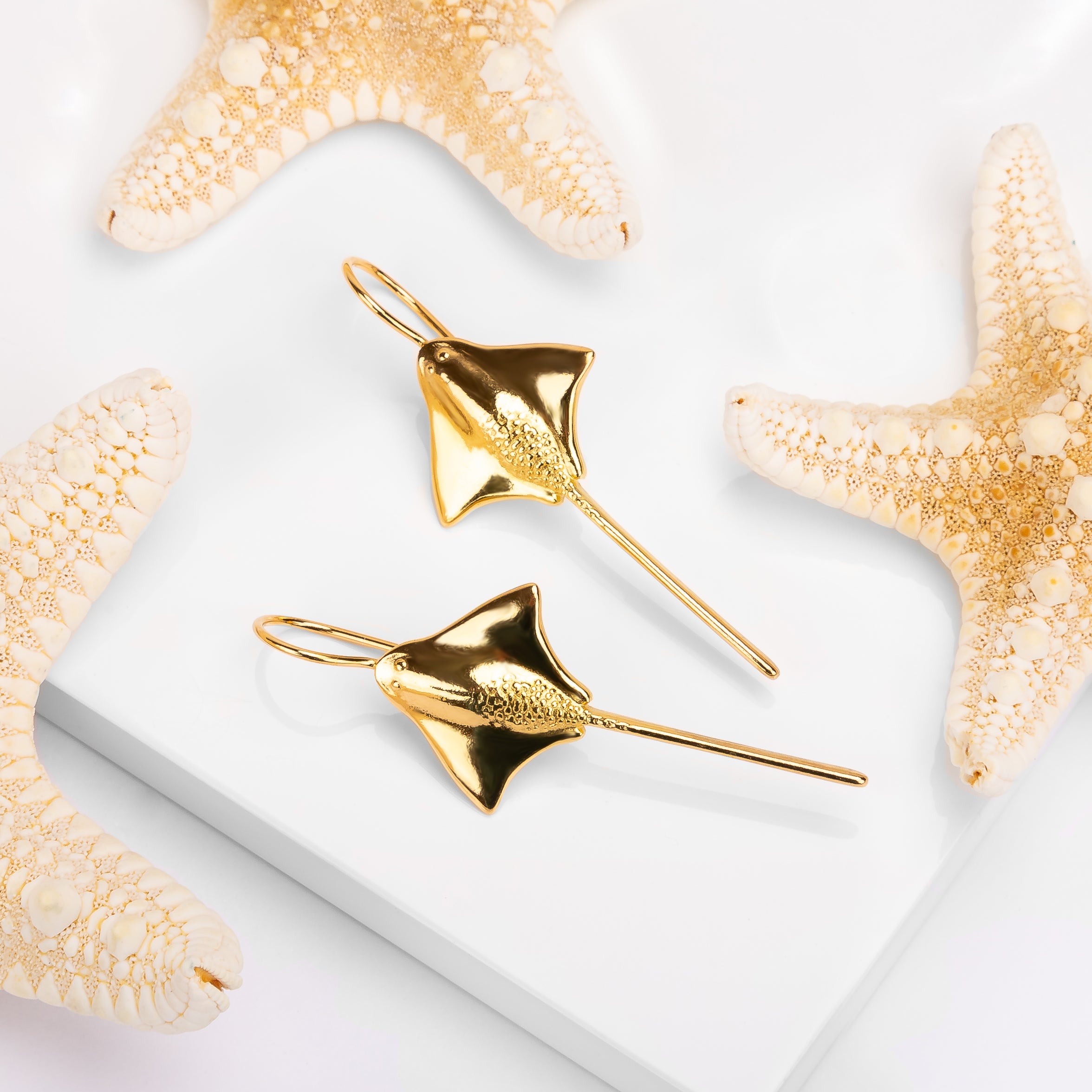 Crafted in 925 silver with 24ct Gold plating, each earring is highly detailed showcasing all the key attributes including its wing like flaps and long tail. Finished with a long solid silver hook, they are dramatic and stylish.