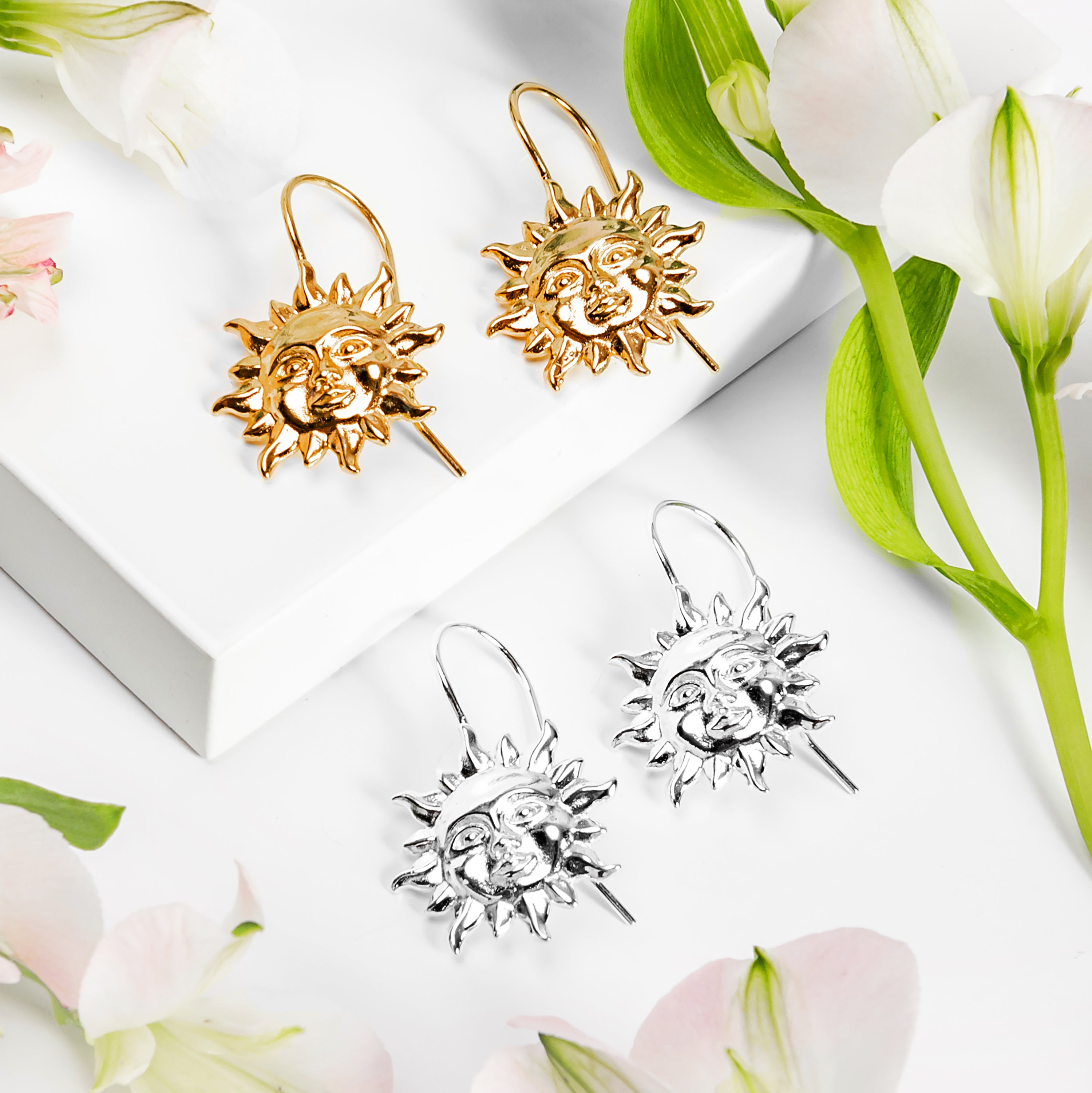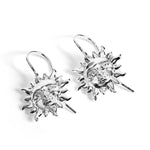 Handcrafted in Sterling Silver these drop earrings have a detailed sun face on open hooks for easy-wear and comfort. Each pair is expertly designed to capture the shape and proportions of a classic design.