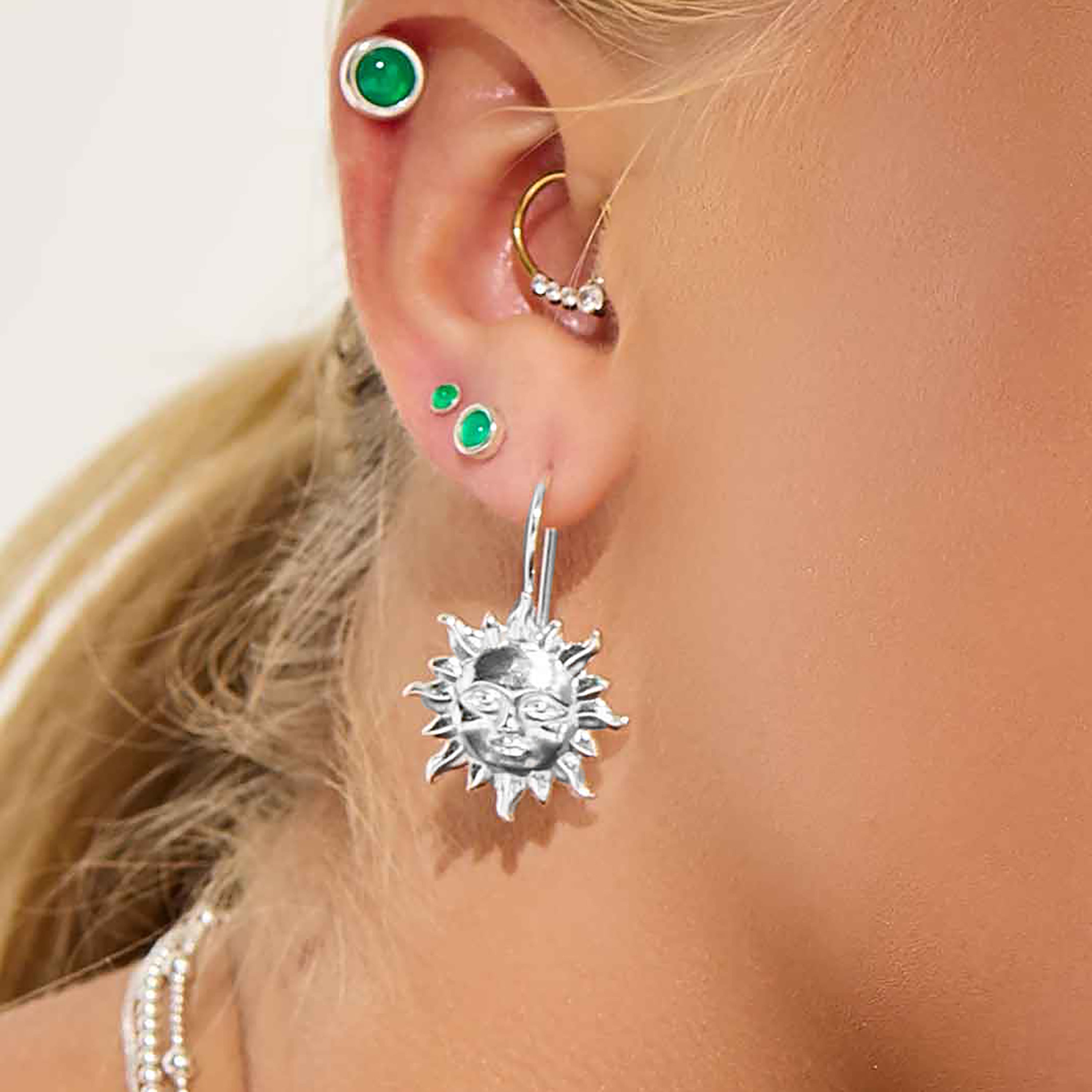 Don't wait for the sun to come to you, bring it now with these Silver Sun of May Sun Face Hook Earrings.