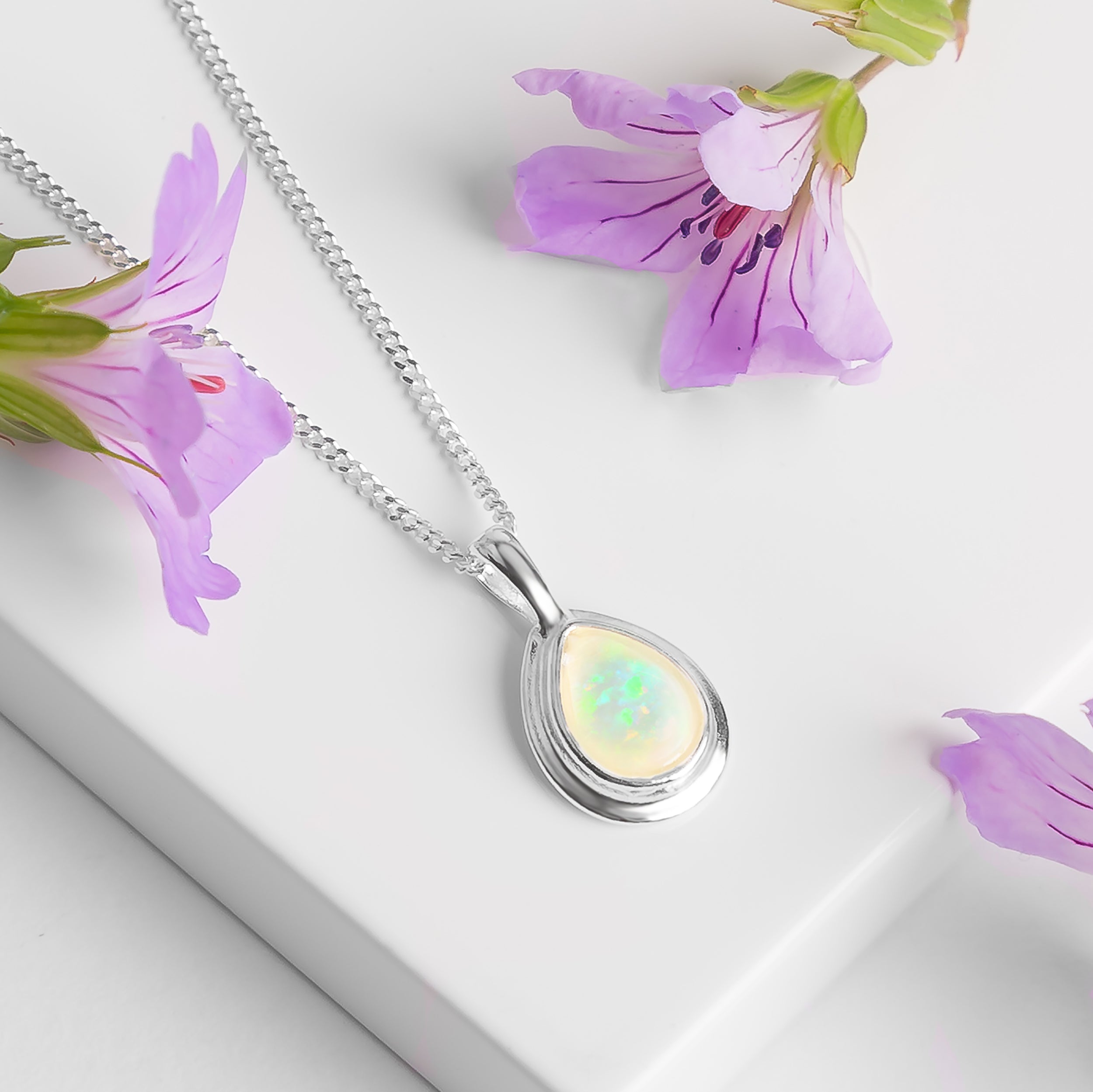 Crafted in a teardrop shape, the natural shimmering Ethiopian Opal gemstone is set into a 925 Sterling Silver mount. With a solid silver chain, it completes this necklace perfectly to suit every occasion.
