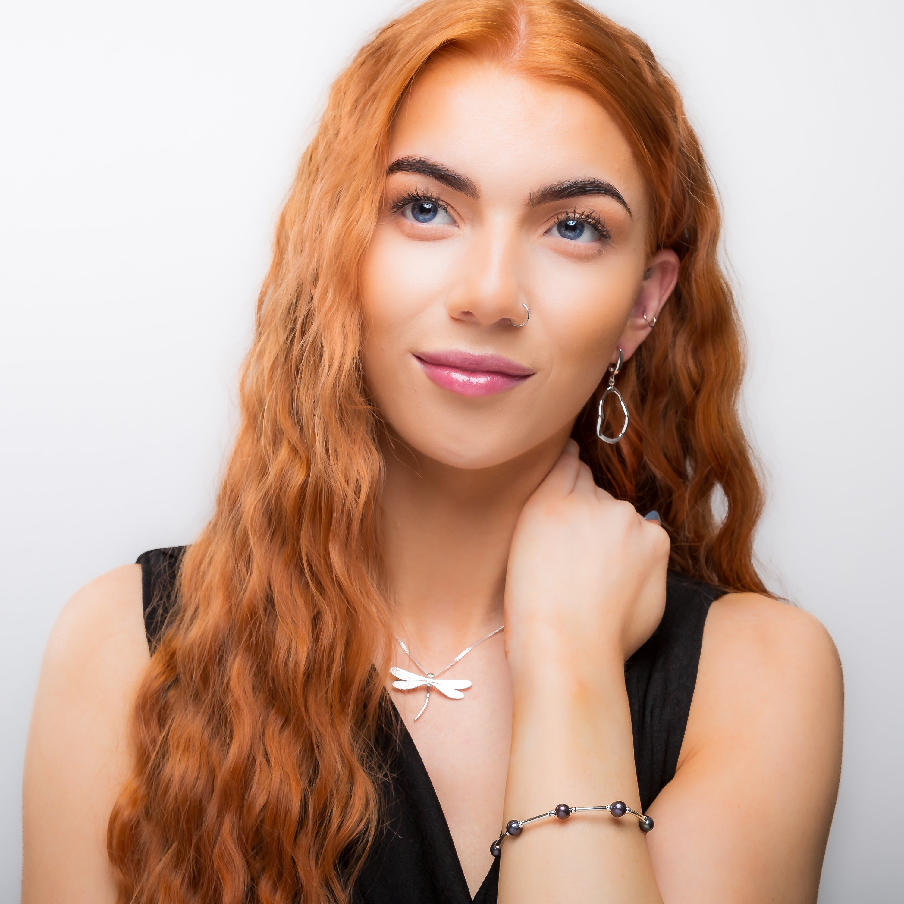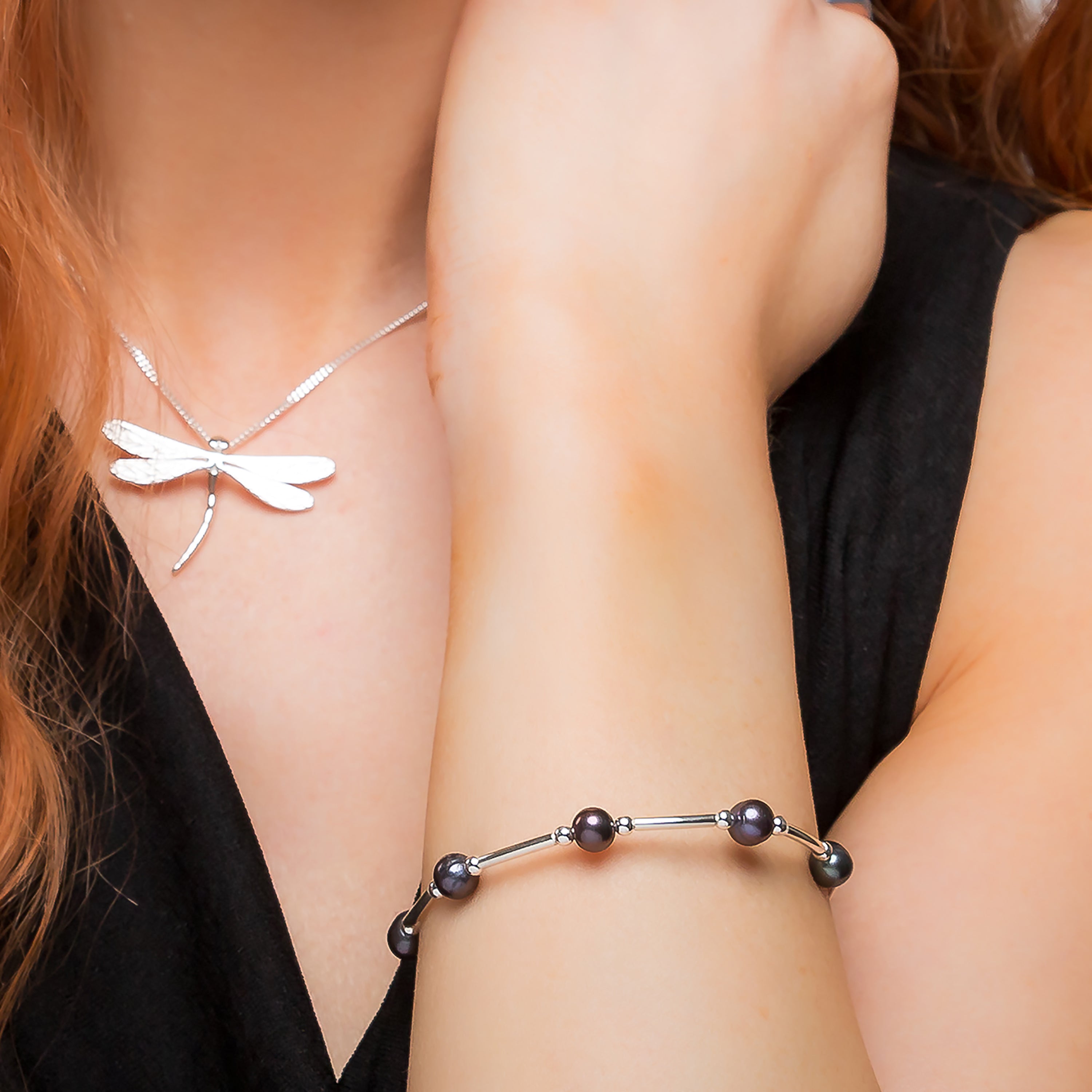 Completely crafted in solid 925 silver, this simple bangle is made from individual freshwater cultured Black Pearl beads and silver tubes threaded onto solid silver wire. It is strong and sturdy, but dainty and delicate too. Finished with a silver bolt clasp fitting, it is secure and easy to wear.