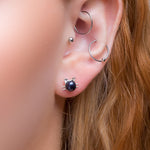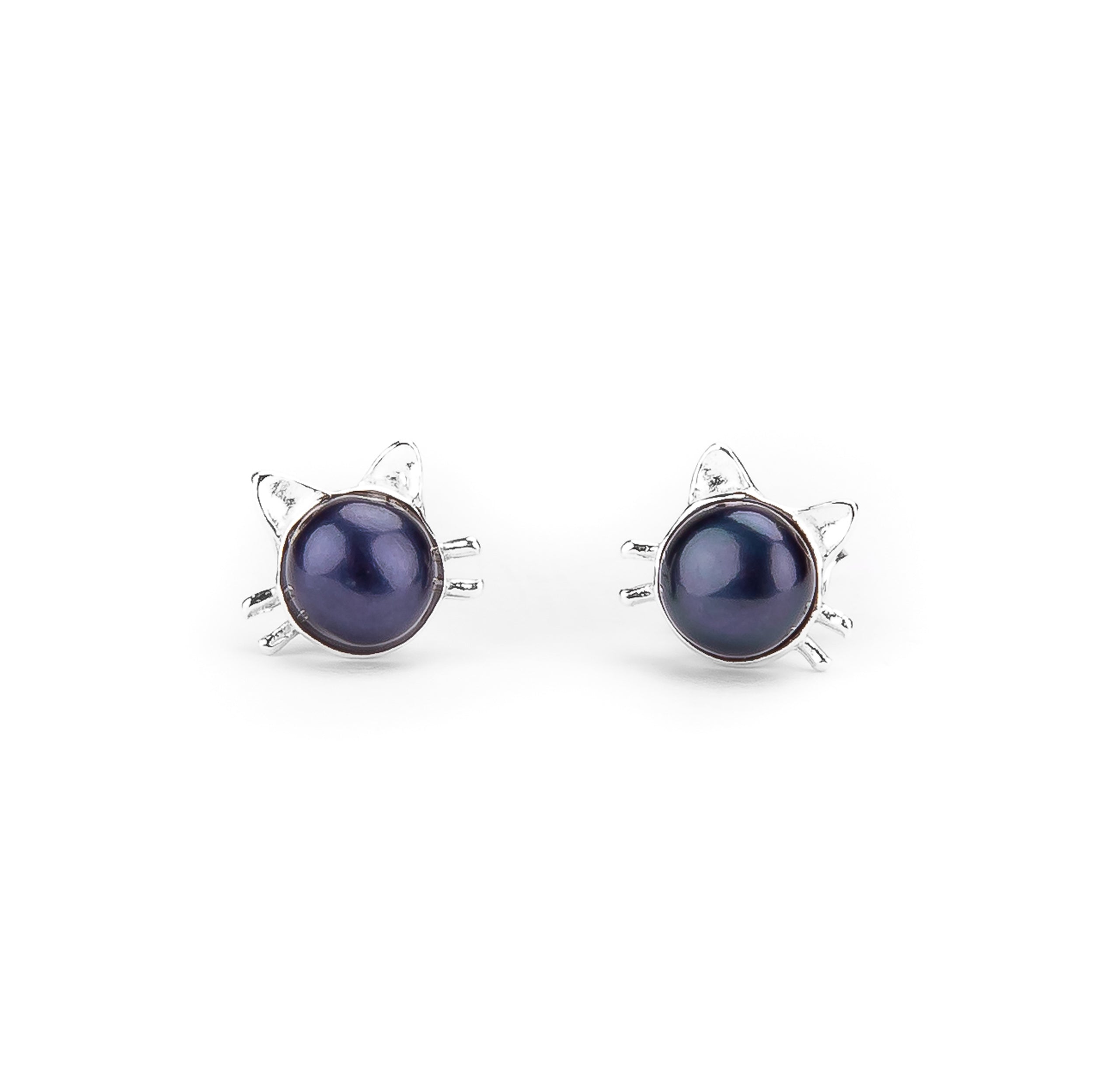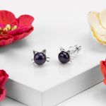 Cute Cat Face Stud Earrings in Silver and Black Pearl