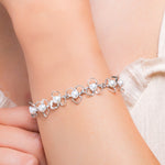 Crafted in 925 solid silver, this bracelet is made up of 13 individual 3 petal flowers with a cultured freshwater pearl at the centre. Each daisy flower is joined via a secure hinge linking them together.  Complete with a lobster clasp fitting.