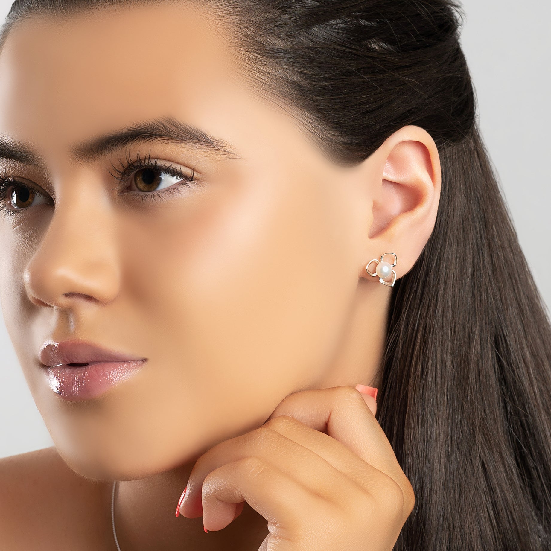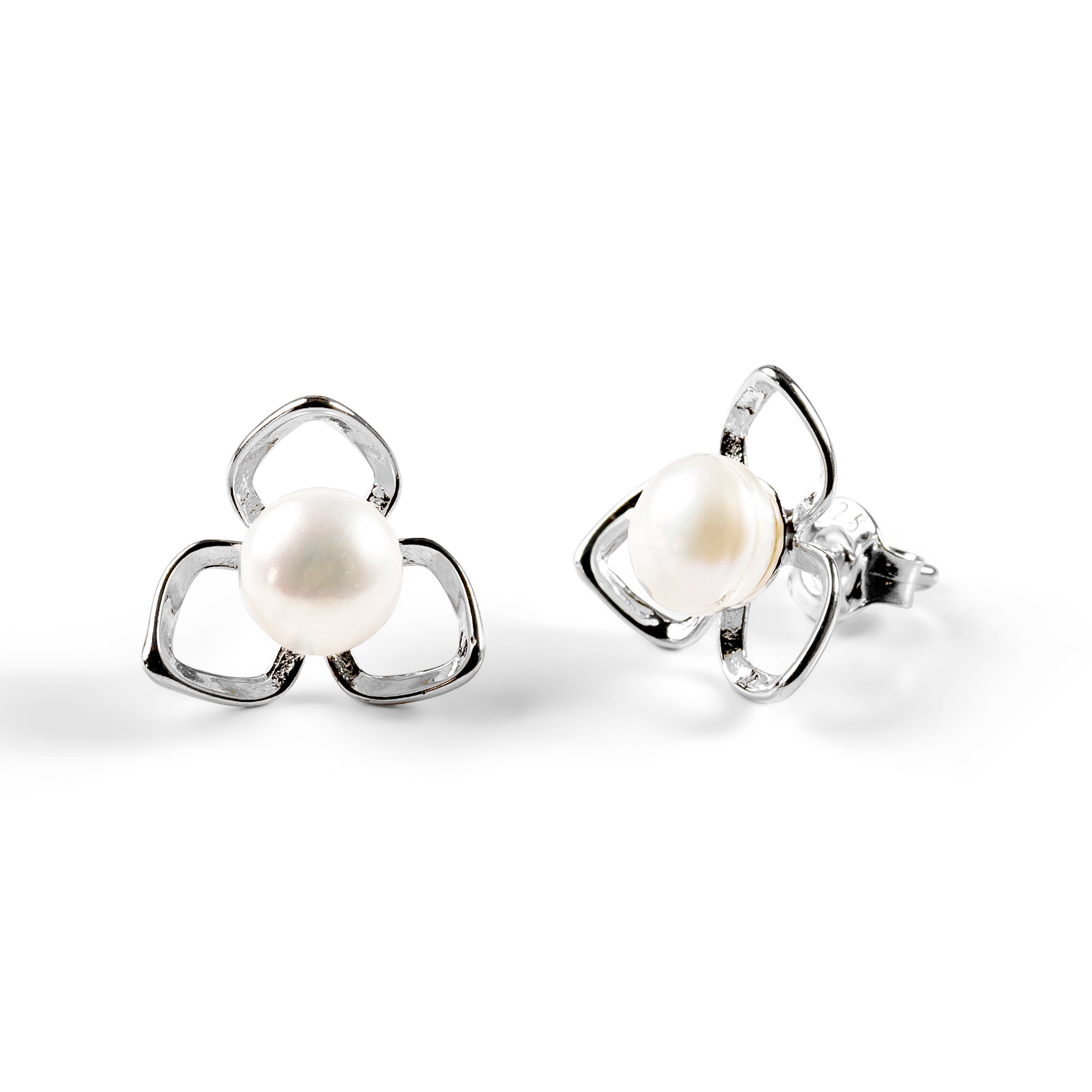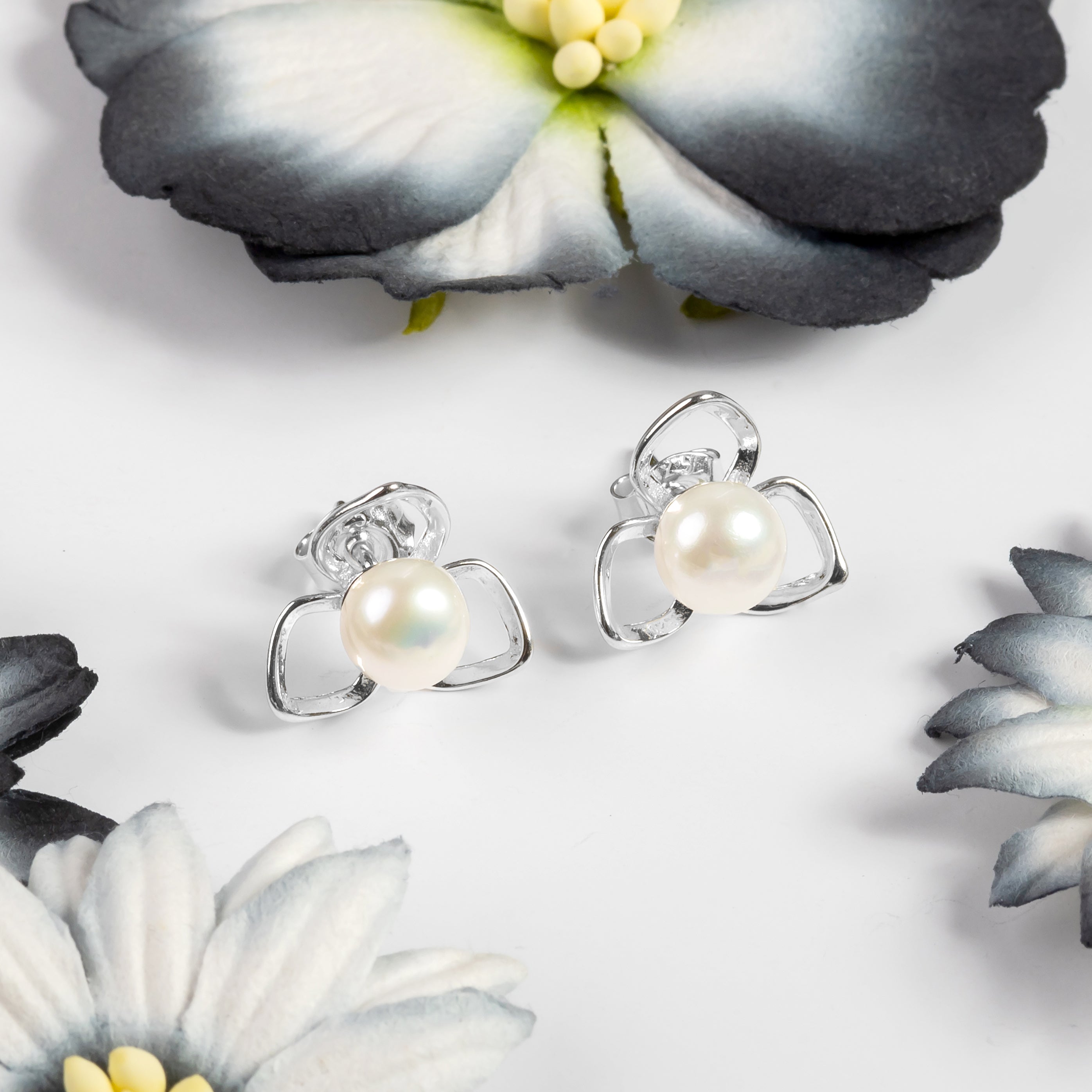 Add a touch of spring to our look with our Silver and White Pearl Flower Petal Stud Earrings.