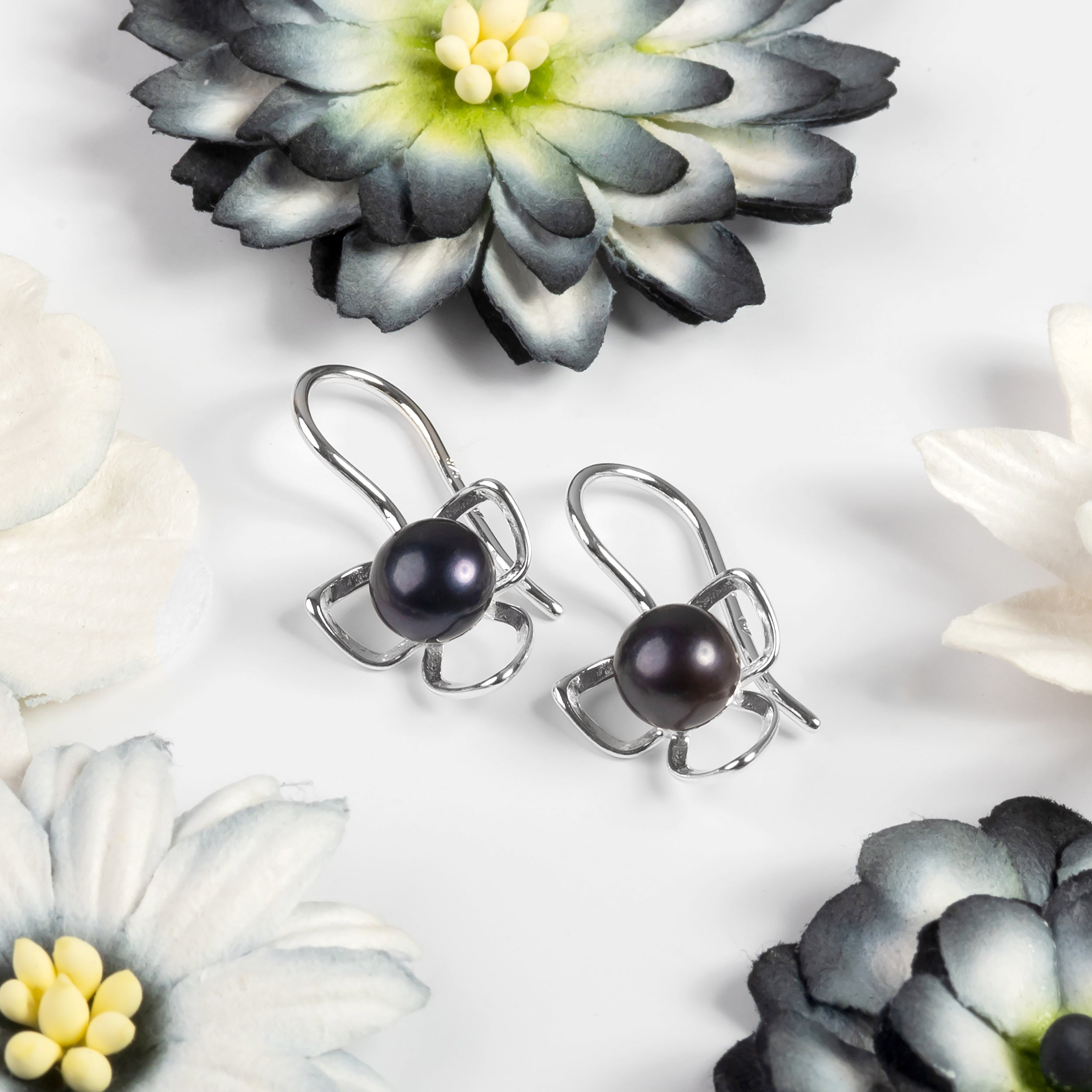 Flower Petal Hook Earrings in Silver & Black Pearl