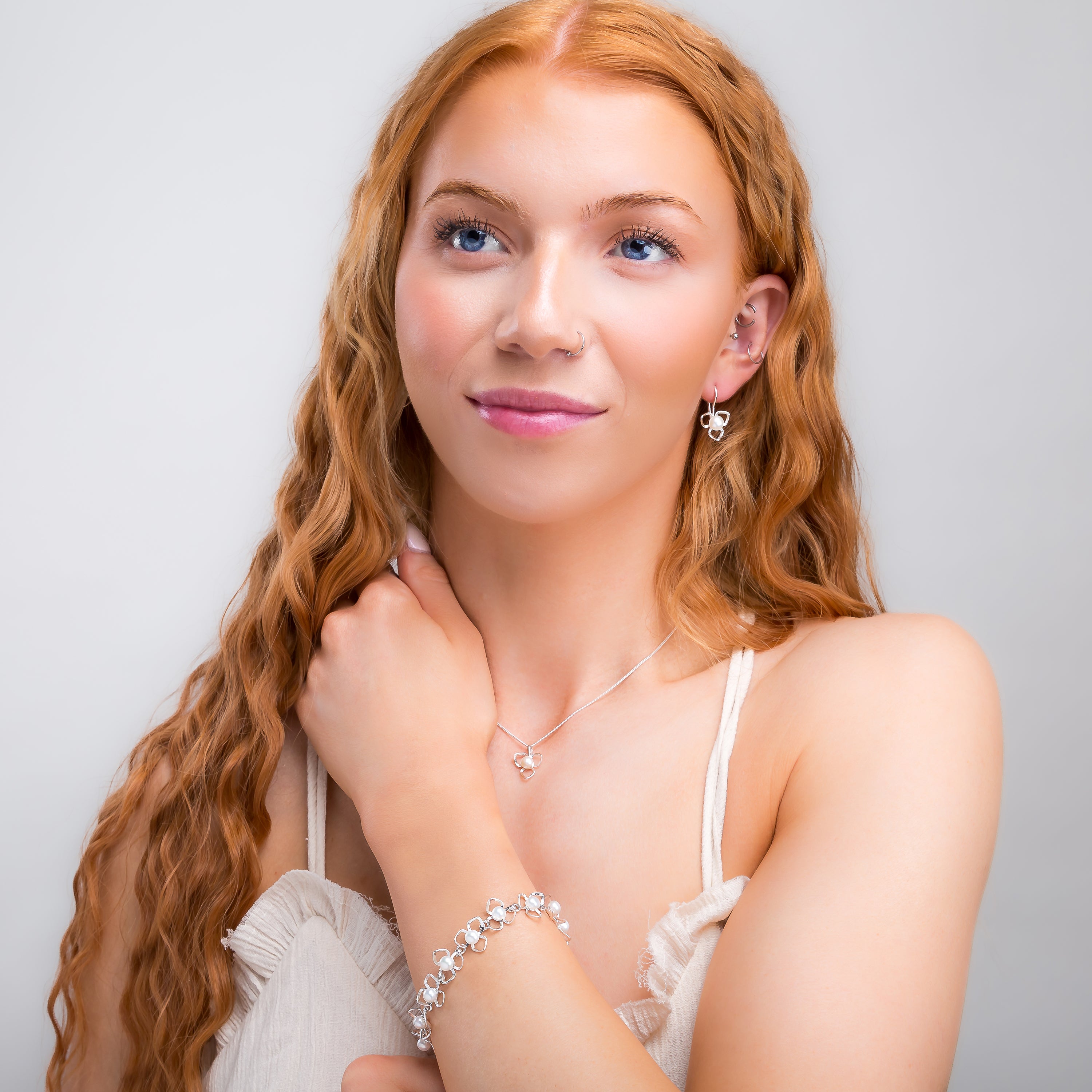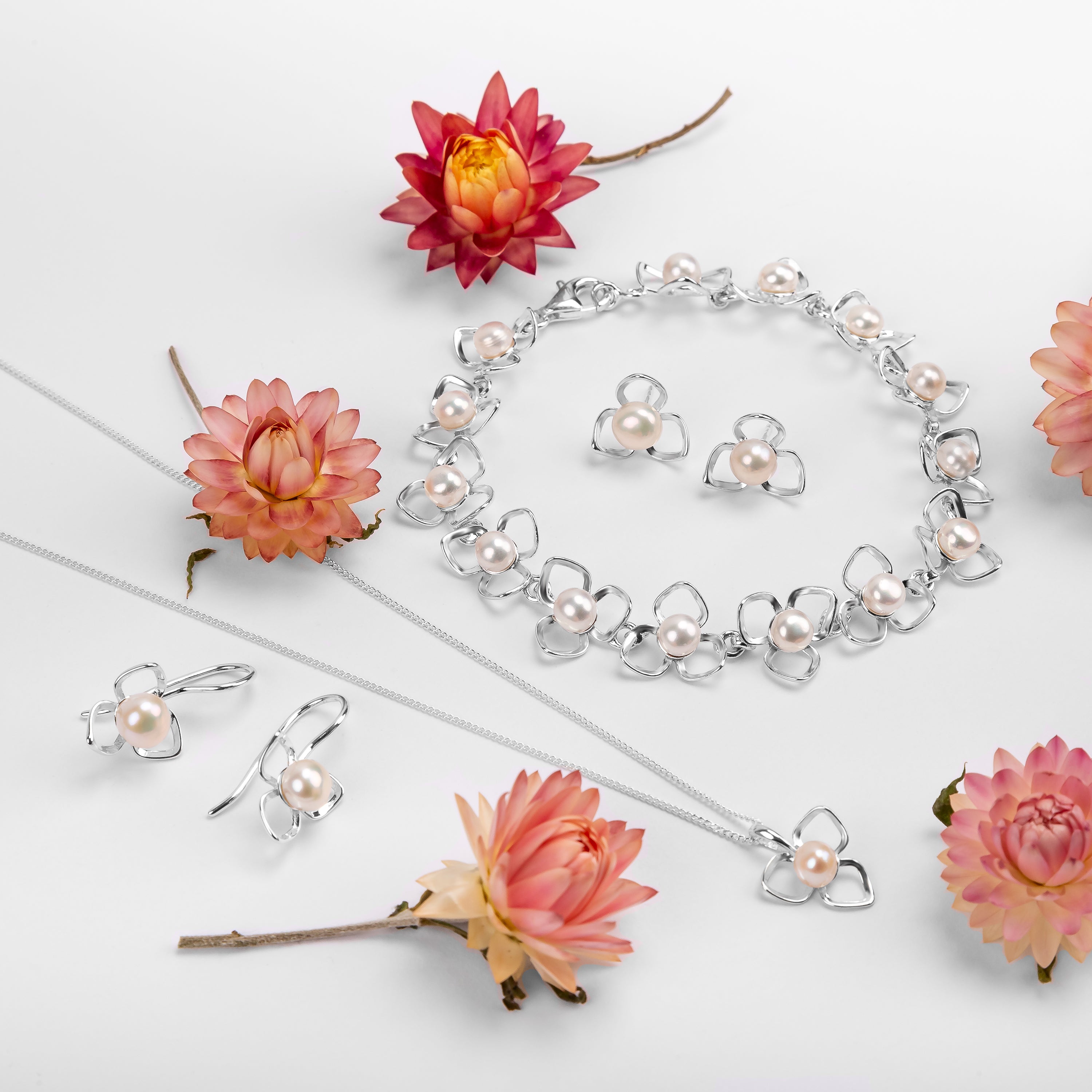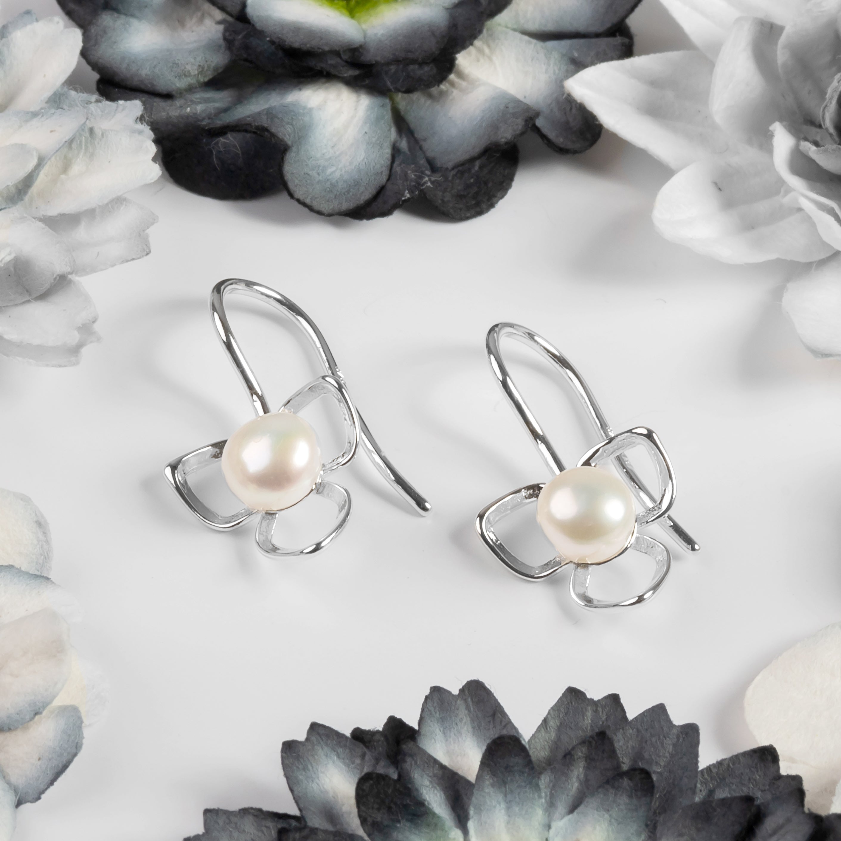 Add a touch of spring to our look with our Silver and White Pearl Flower Petal Hook Earrings.
