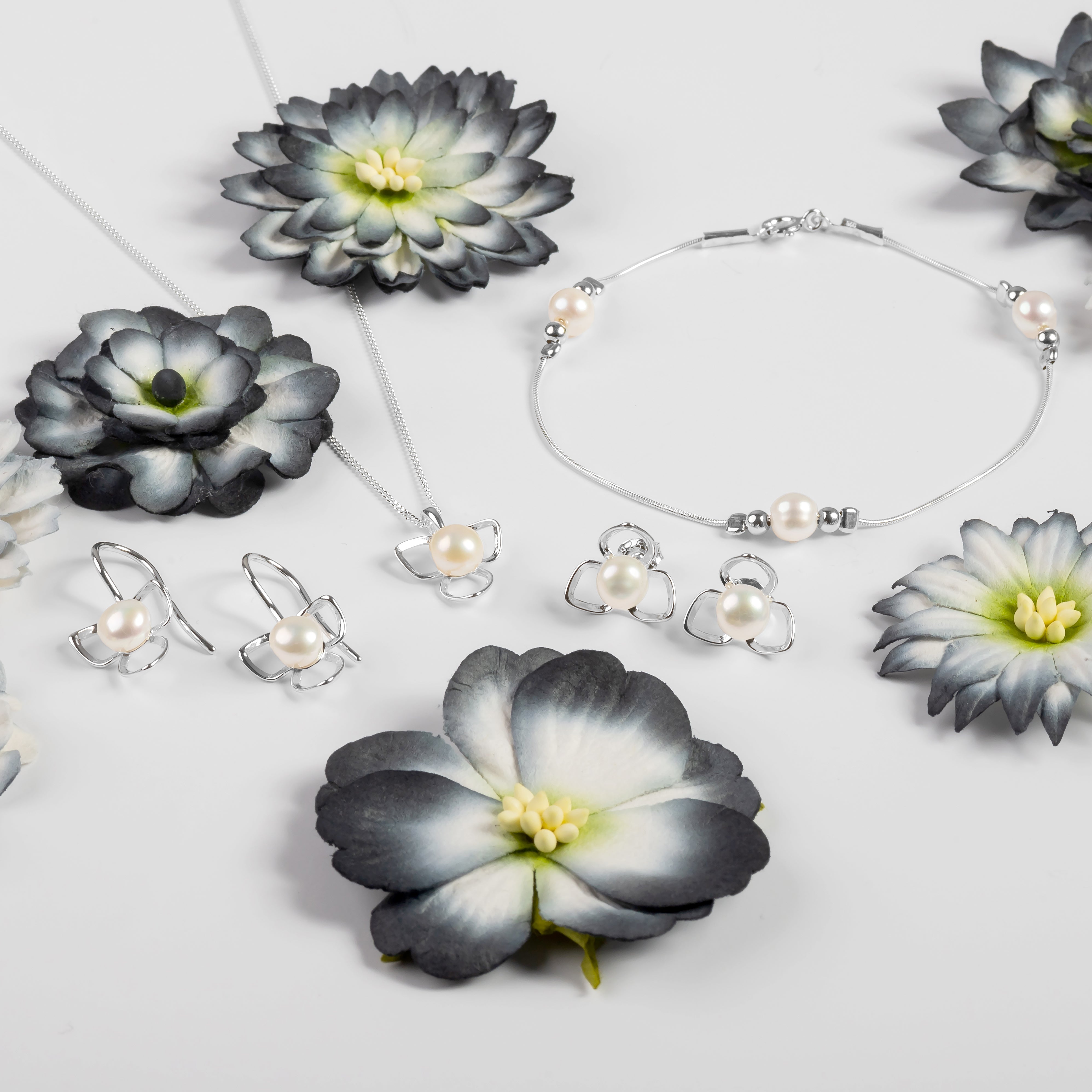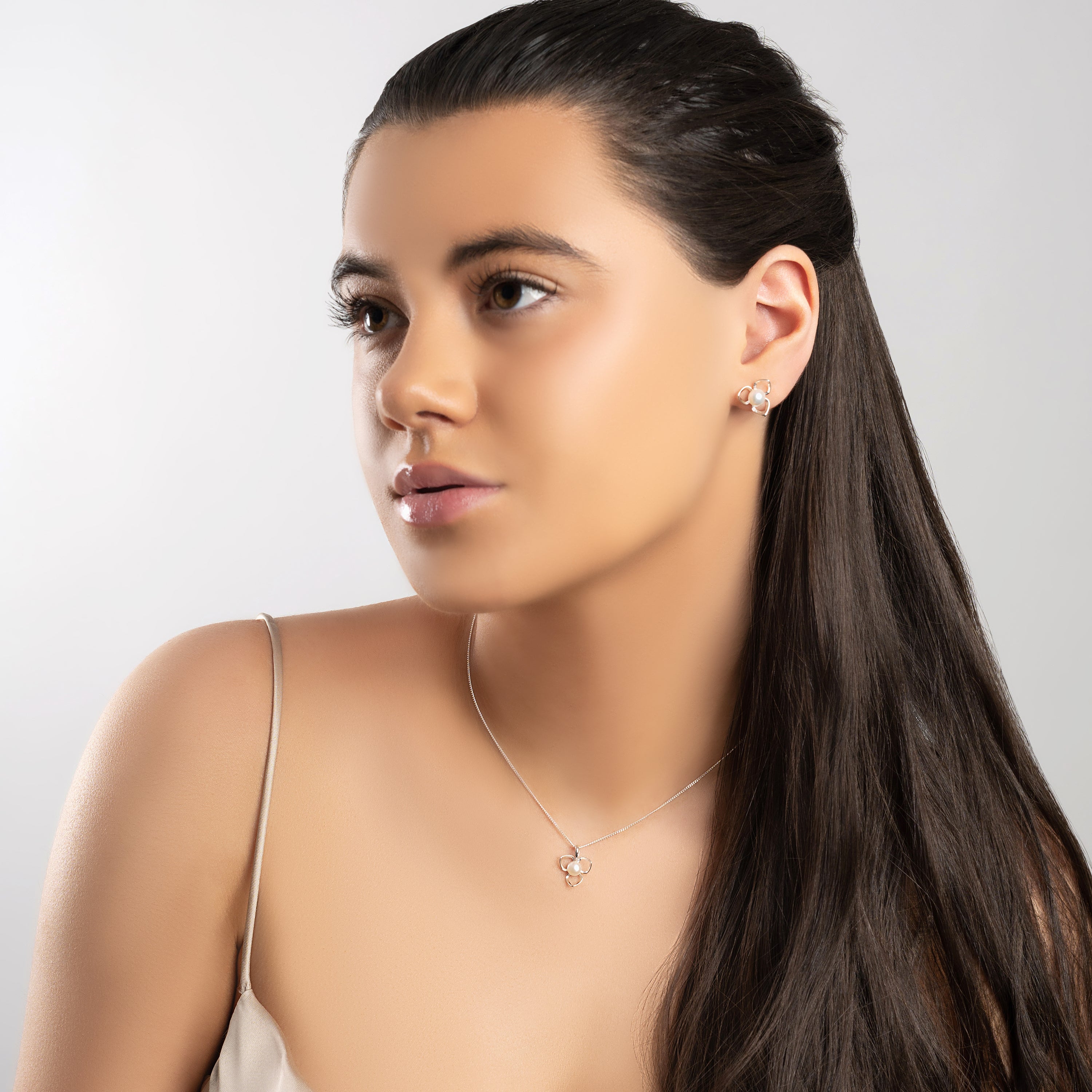 Handcrafted in 925 solid silver, the pearl itself sits at the centre of the flower which is made up of 3 pointed petals.