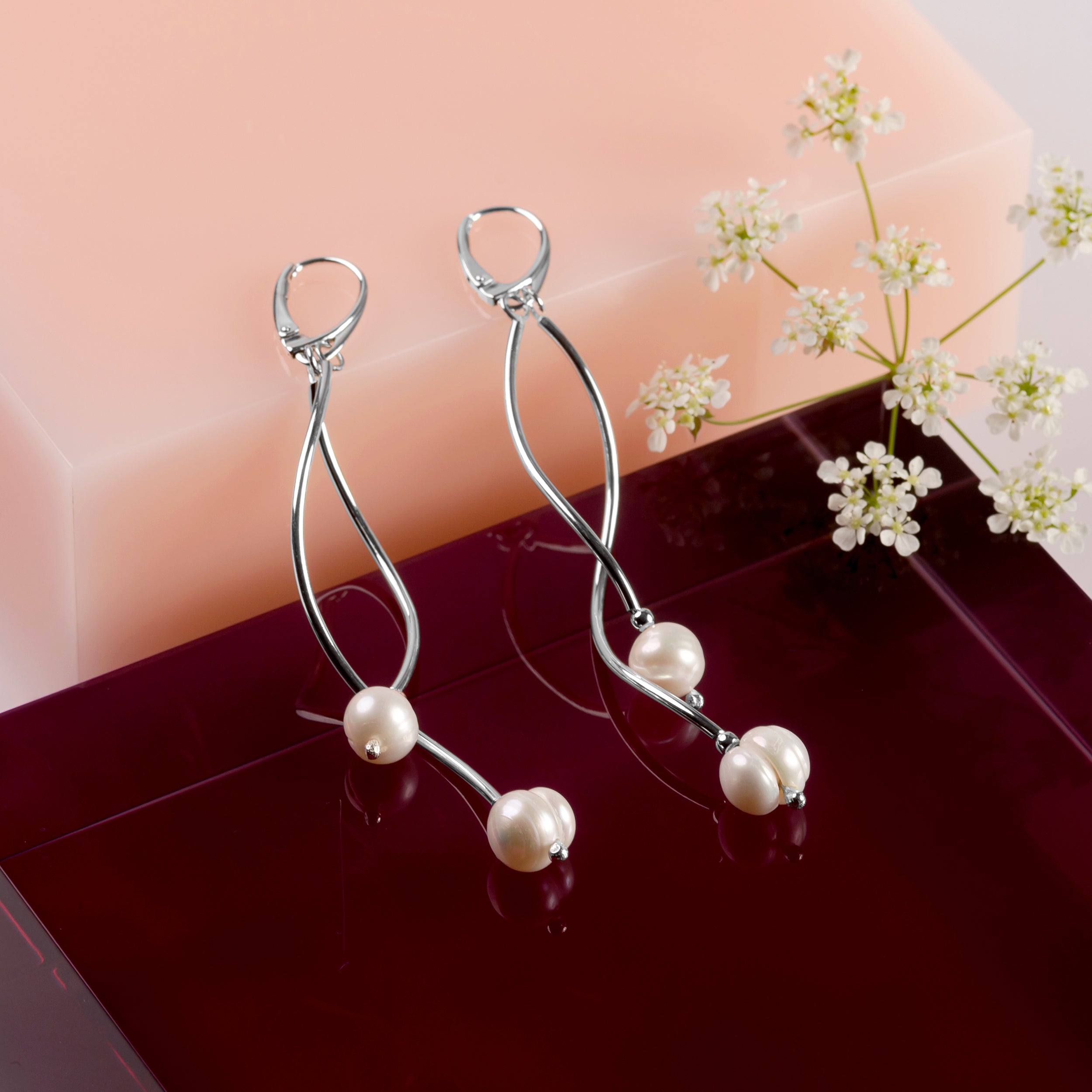 Handcrafted in Sterling Silver, the earrings are made from 2 wave strands with a natural cultured pearl threaded on the end. Finished with a secure clasp back hook fitting.