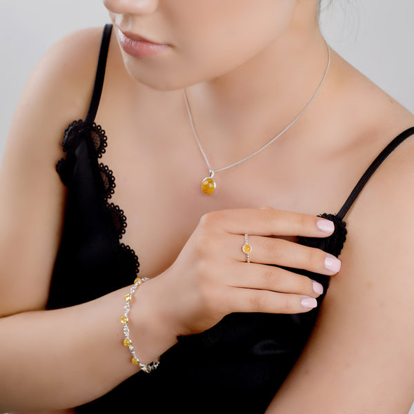 Add a splash of colour to your repertoire with our Silver and Amber Round Charm Bead Ring.