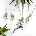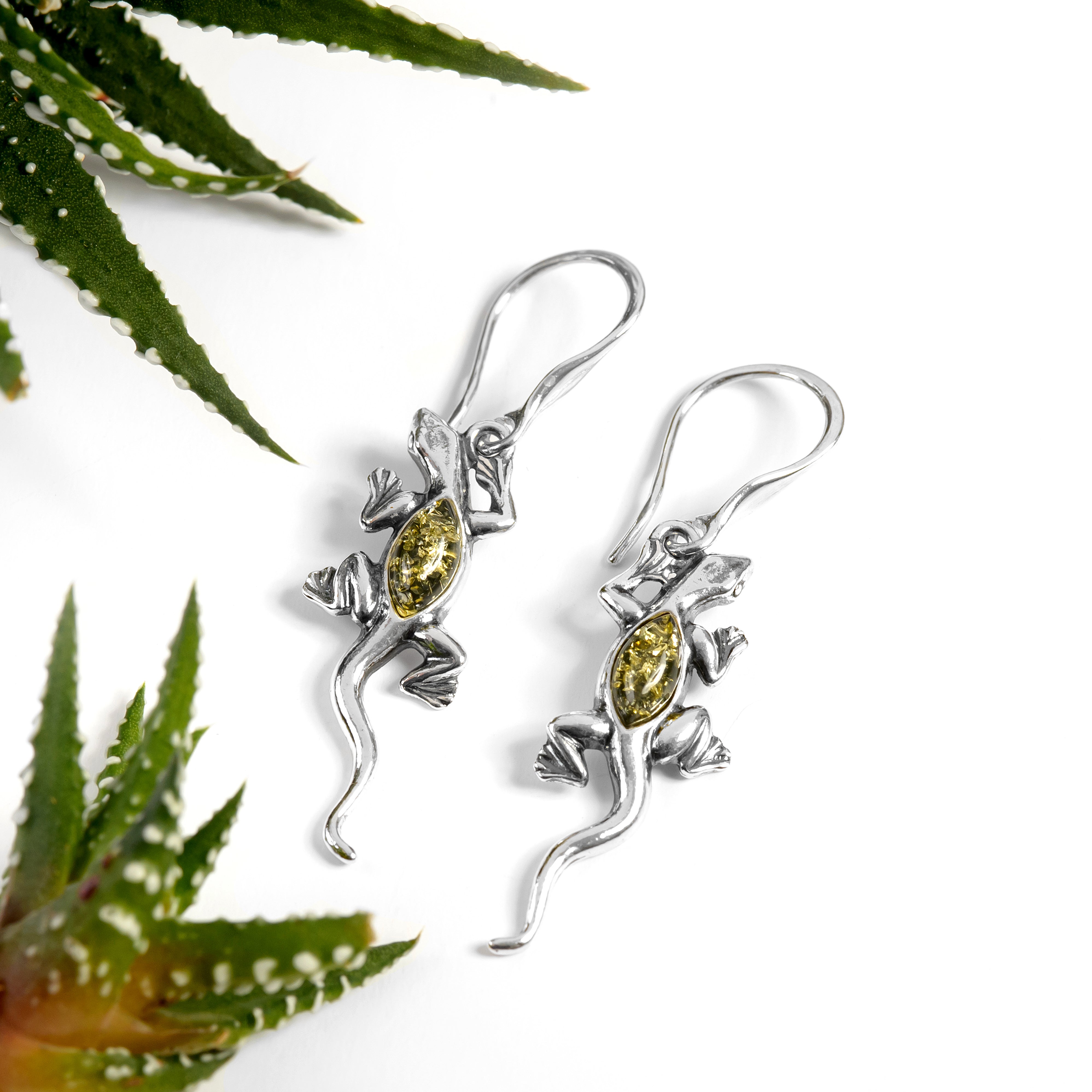 Quirky and fun Silver and Green Amber Lizard Drop Earrings will add some an exotic theme to your style.