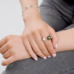 Inspired by our love of contemporary style our Silver and Green Amber Open Double Pebble Ring is perfect for those who love statement jewellery.