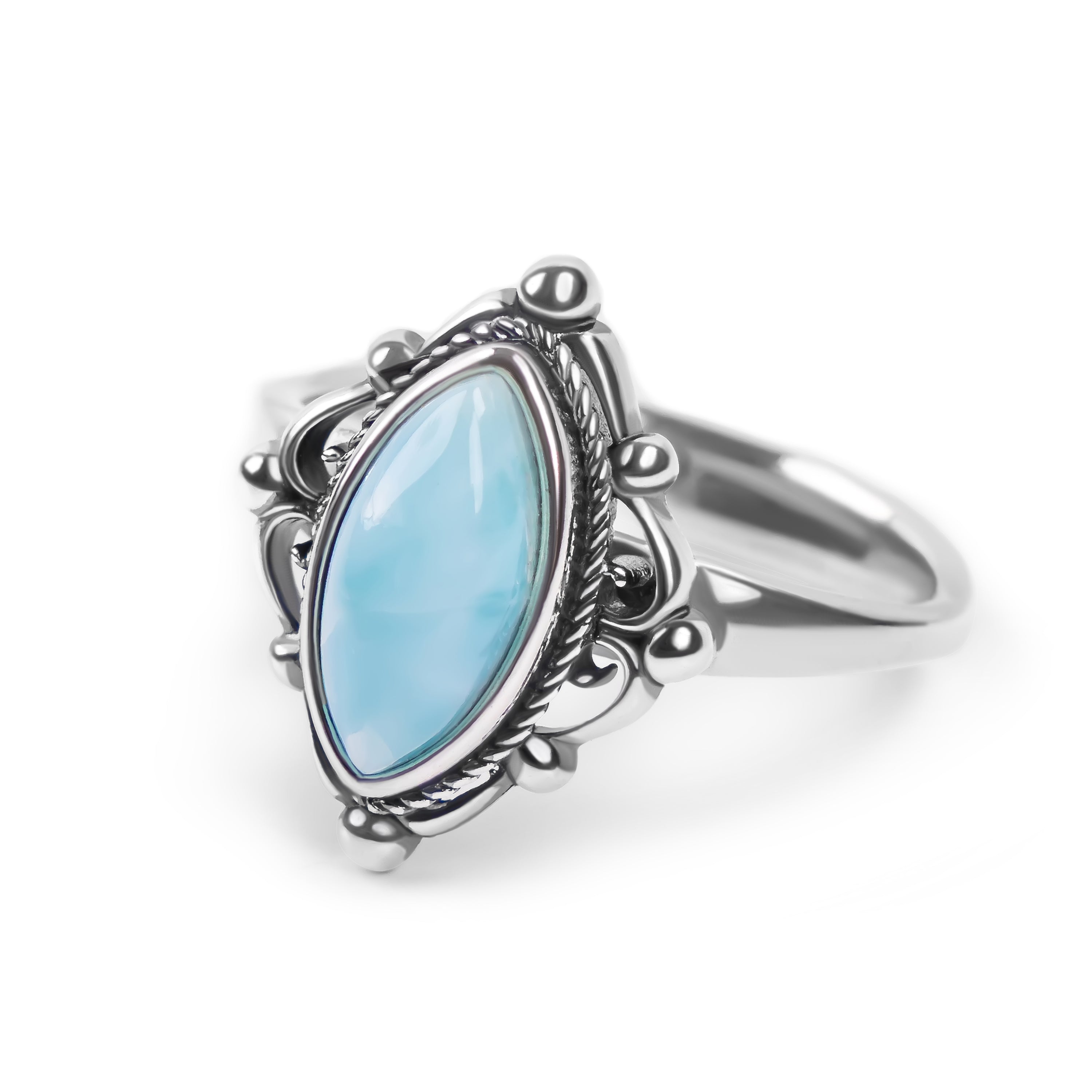 Timeless elegance meets natural beauty in this vintage-inspired ring, featuring a stunning natural larimar stone set in lustrous 925 silver. The soft blue hues of larimar evoke a serene, ocean-like quality, making this piece perfect for everyday wear or special occasions.