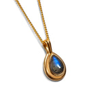 Crafted in a teardrop shape, the natural shimmering Labradorite gemstone is set into a 925 Sterling Silver with 24ct Gold plated mount. With a solid silver chain, it completes this necklace perfectly to suit every occasion.