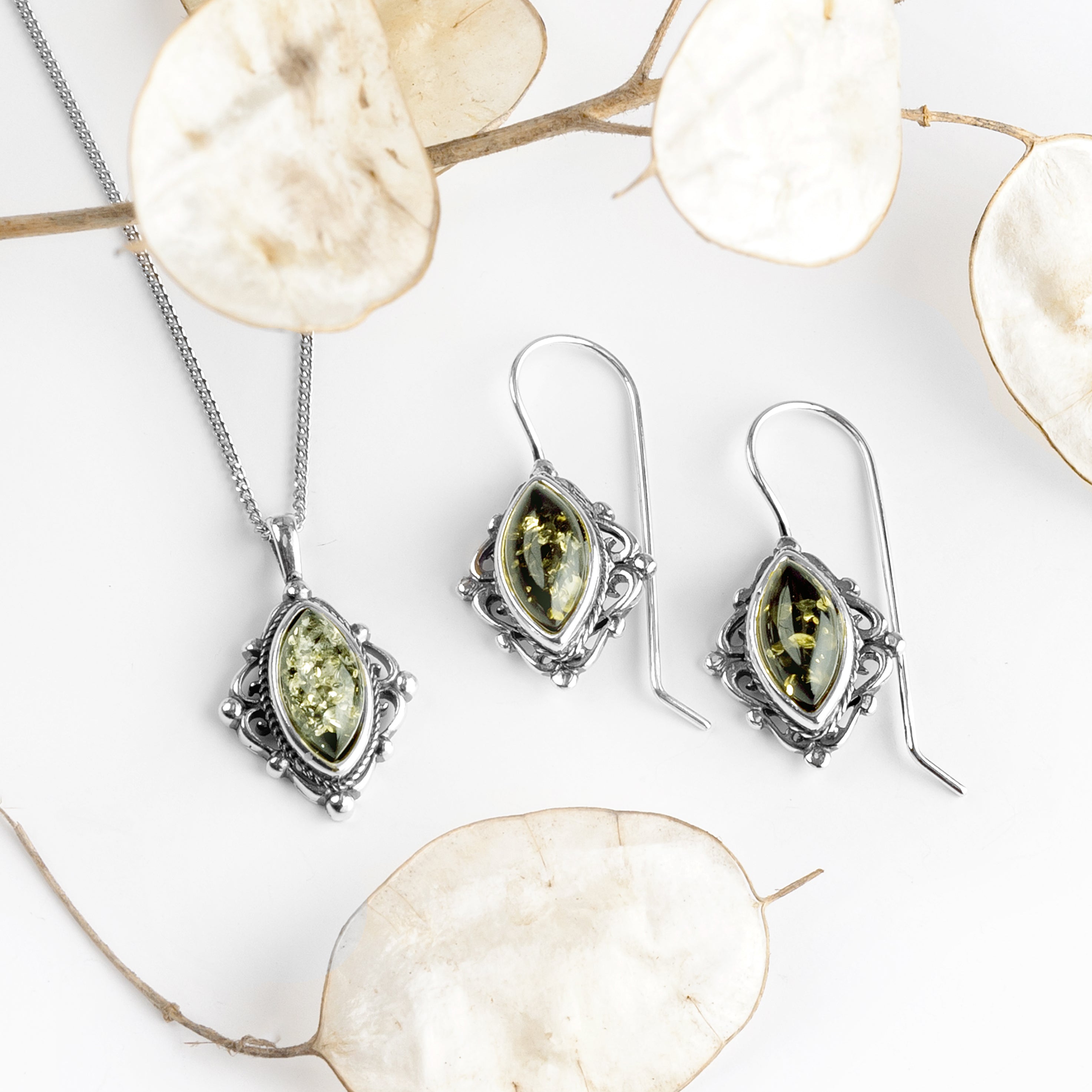 Our Silver and Green Amber Vintage Style Necklace is perfect for those for love period inspired jewellery.