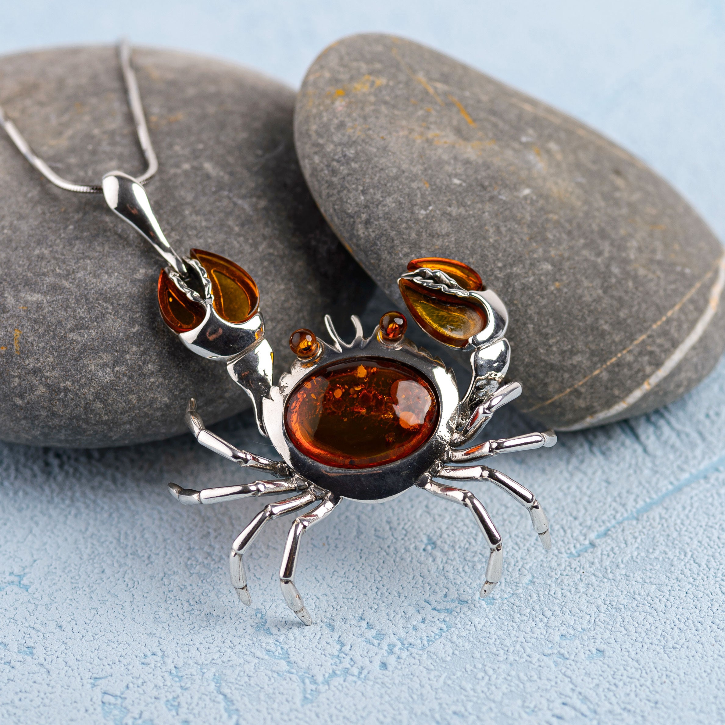 Handcrafted in 925 silver, this unique piece is adorned with genuine Baltic Amber gemstones in the body, claws and eyes. With highly detailed body and legs too, it truly is one of a kind. Complete with a solid silver chain it will be sure to turn heads at any occasion.