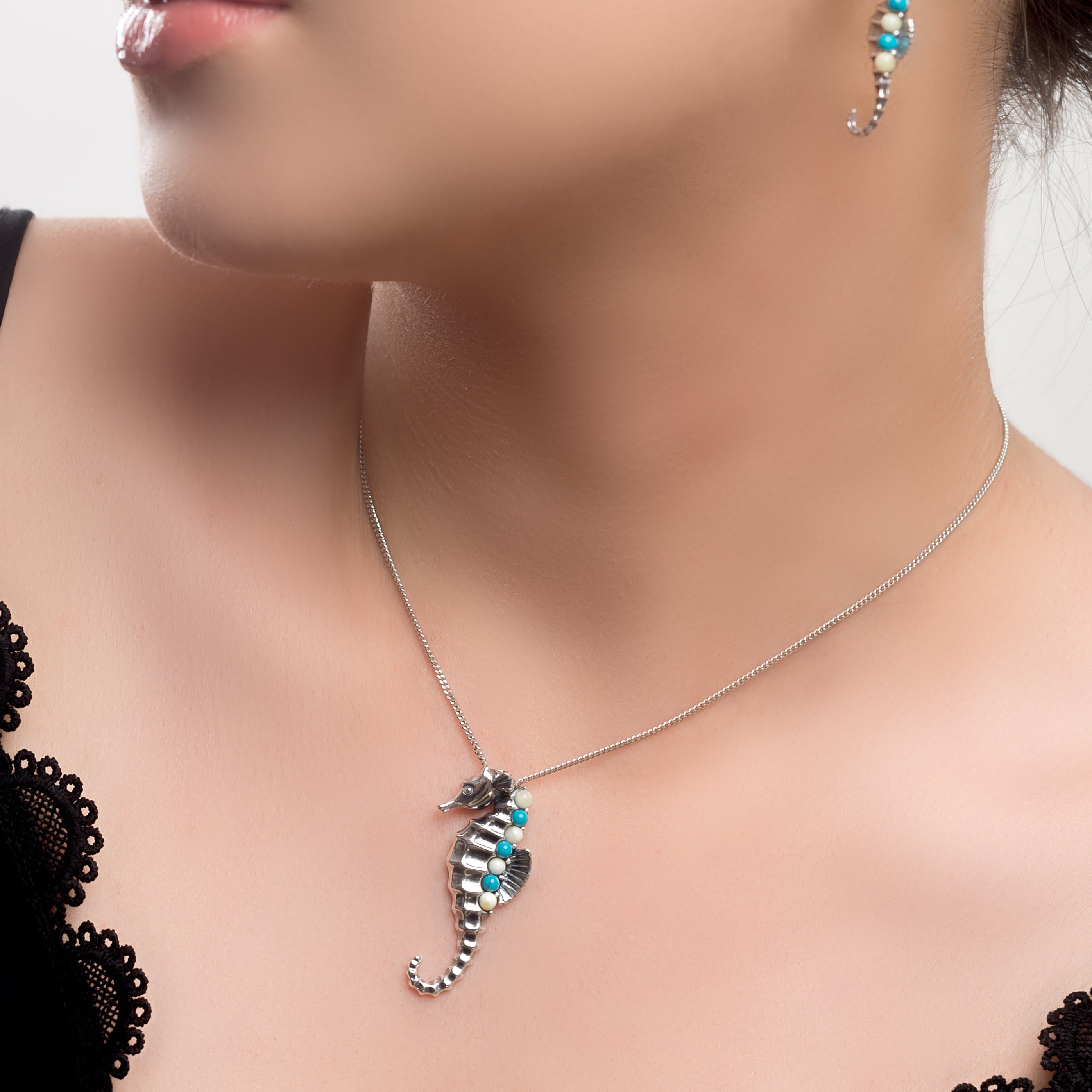 Large Seahorse Necklace in Silver, Turquoise and Amber