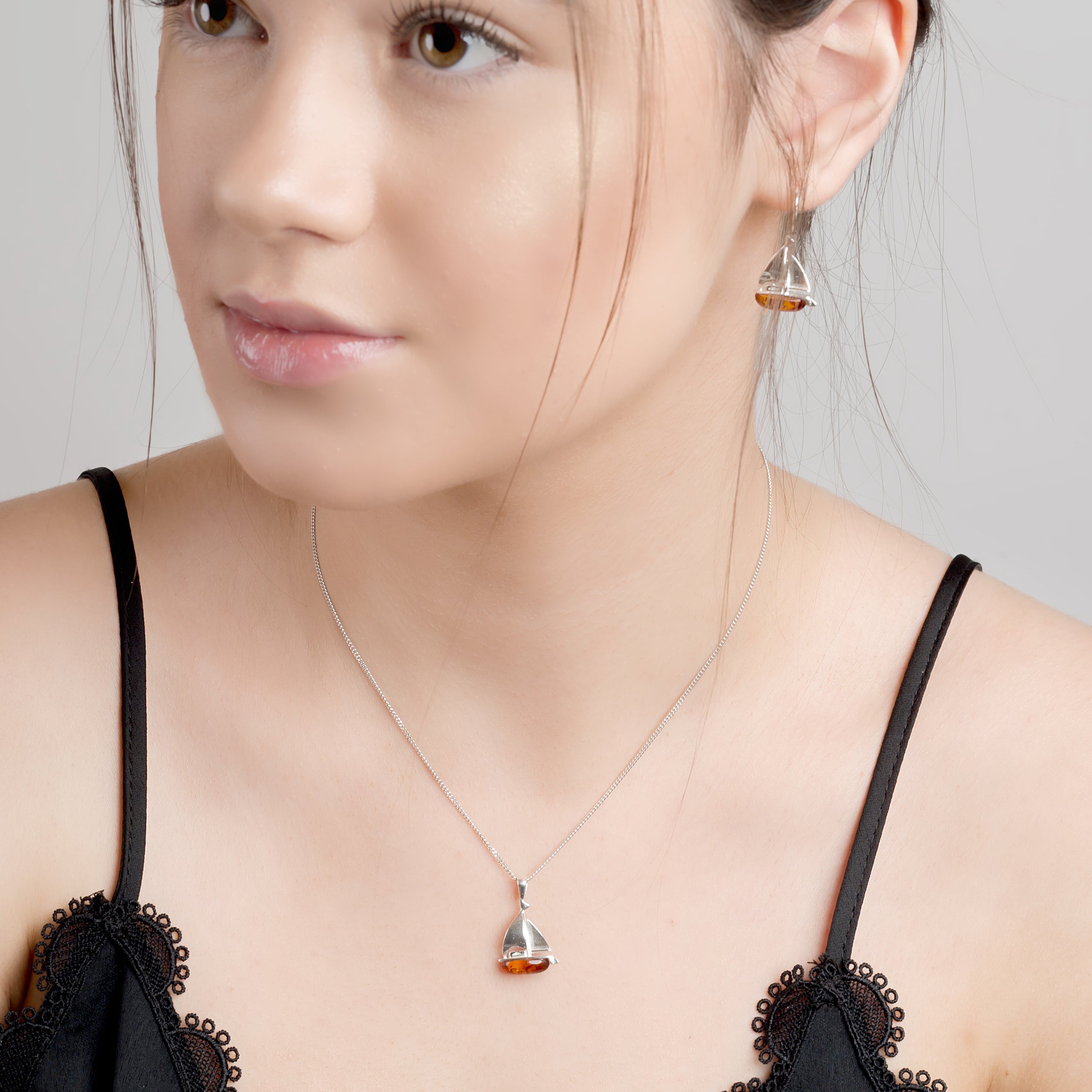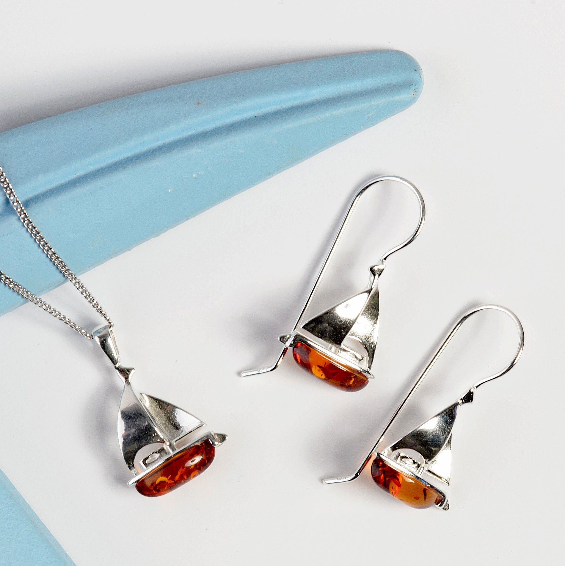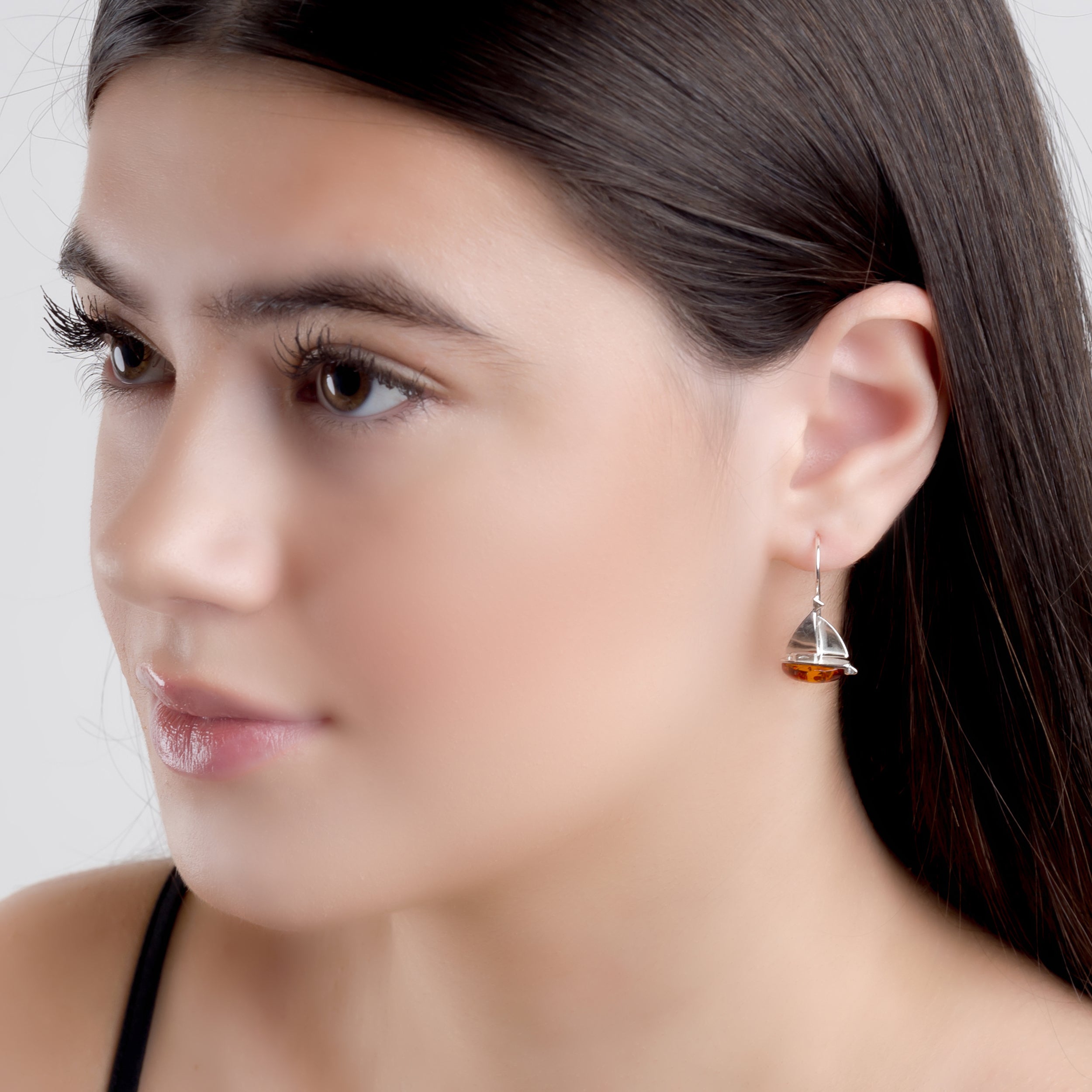 Crafted in 925 silver, each earrings has a genuine Baltic Amber gemstone to represent the hull of the boat and is finished with a silver designed sail. Finished with solid silver hooks, these delightful earrings can be worn securely all day long.