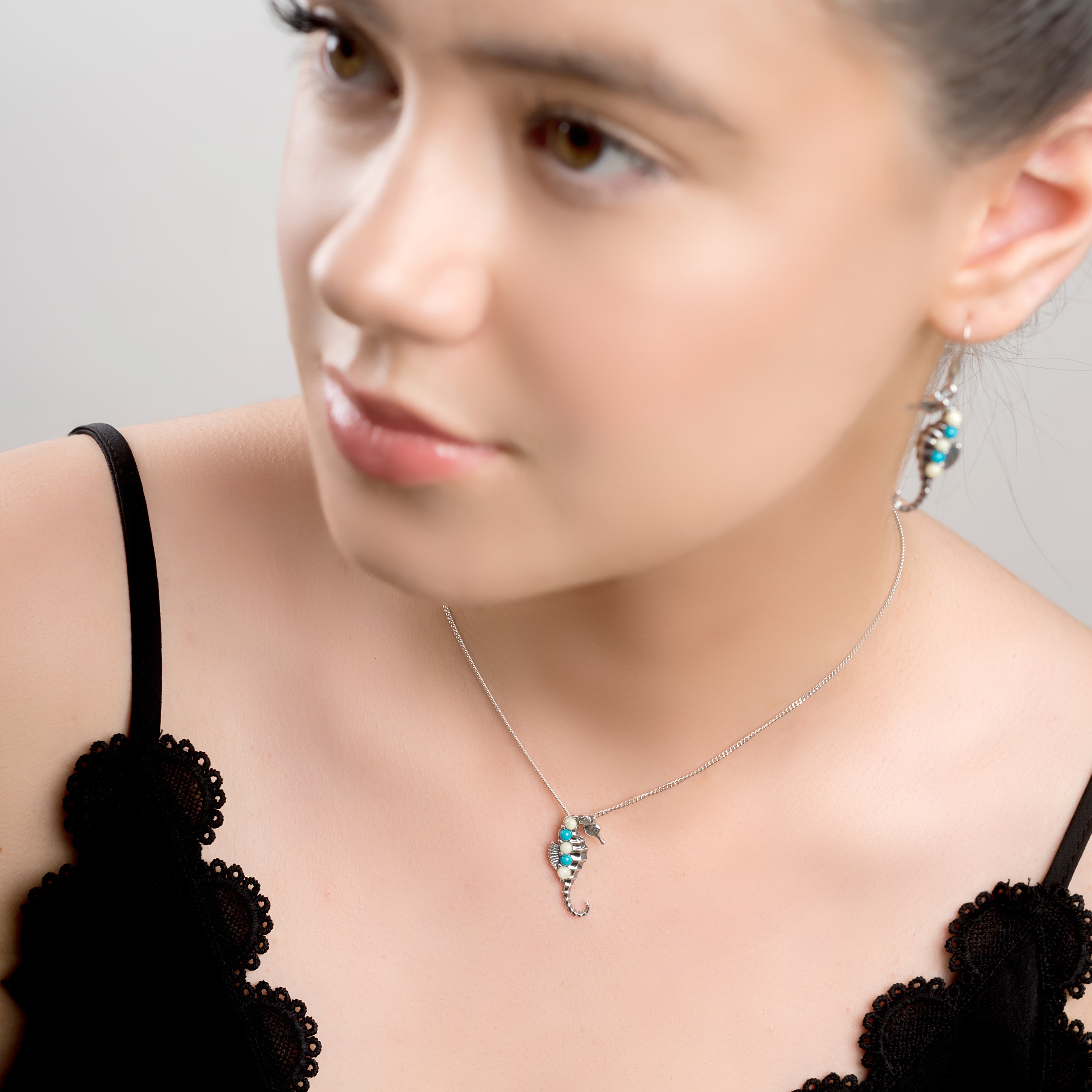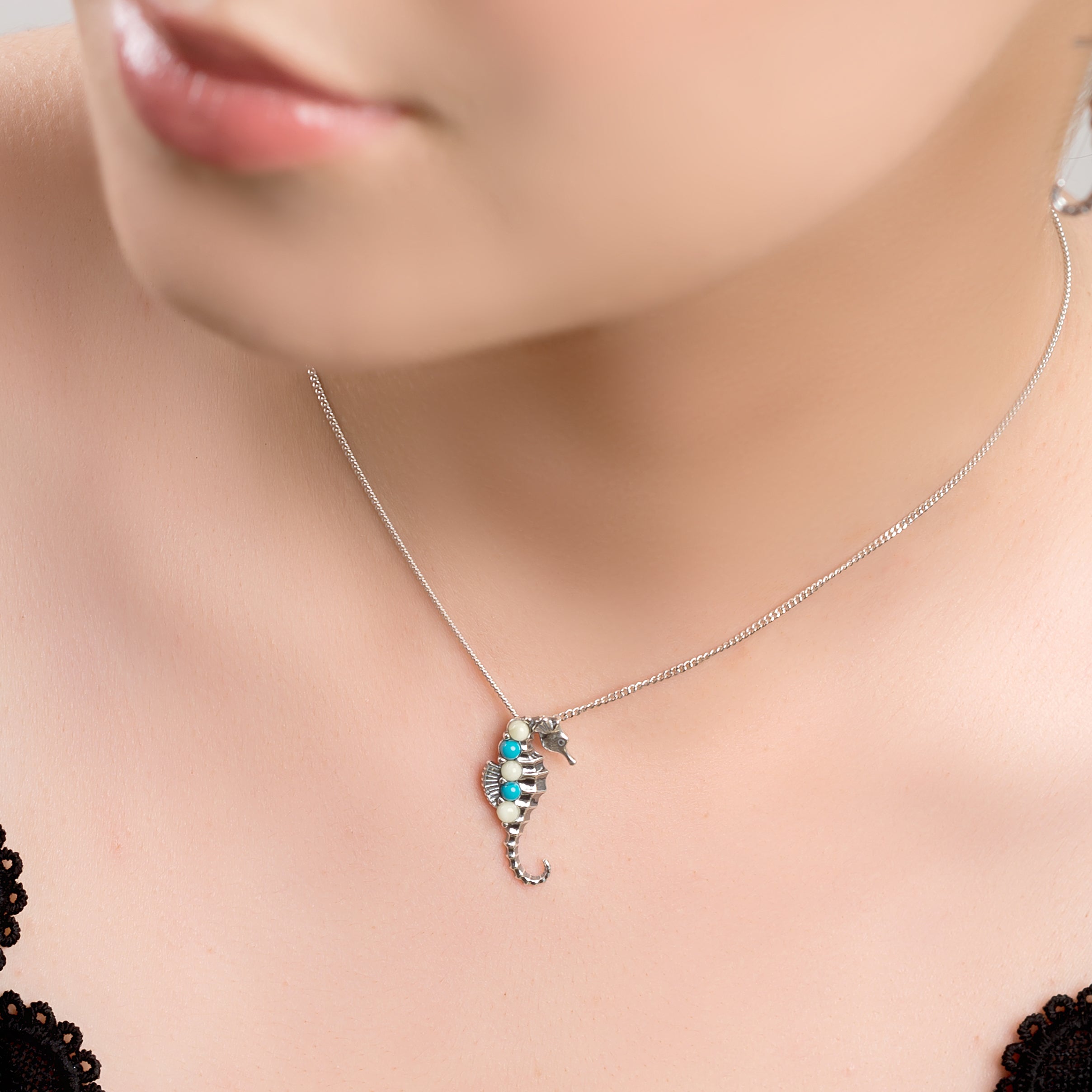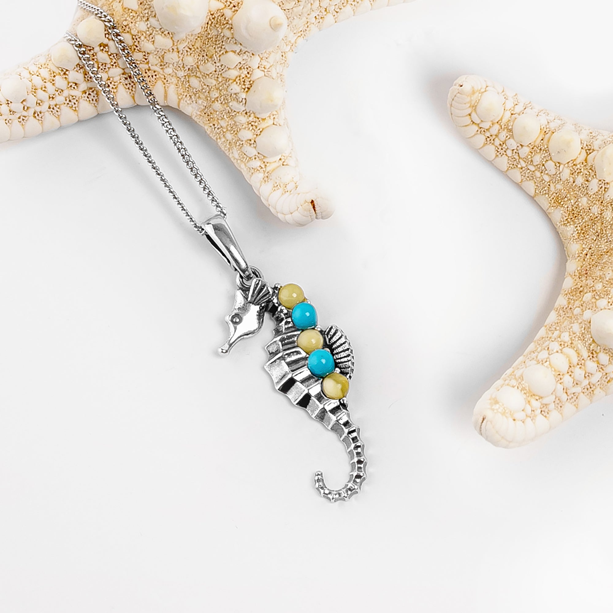 Capture the spirit of the ocean with our Silver, Amber, and Turquoise Seahorse Necklace.