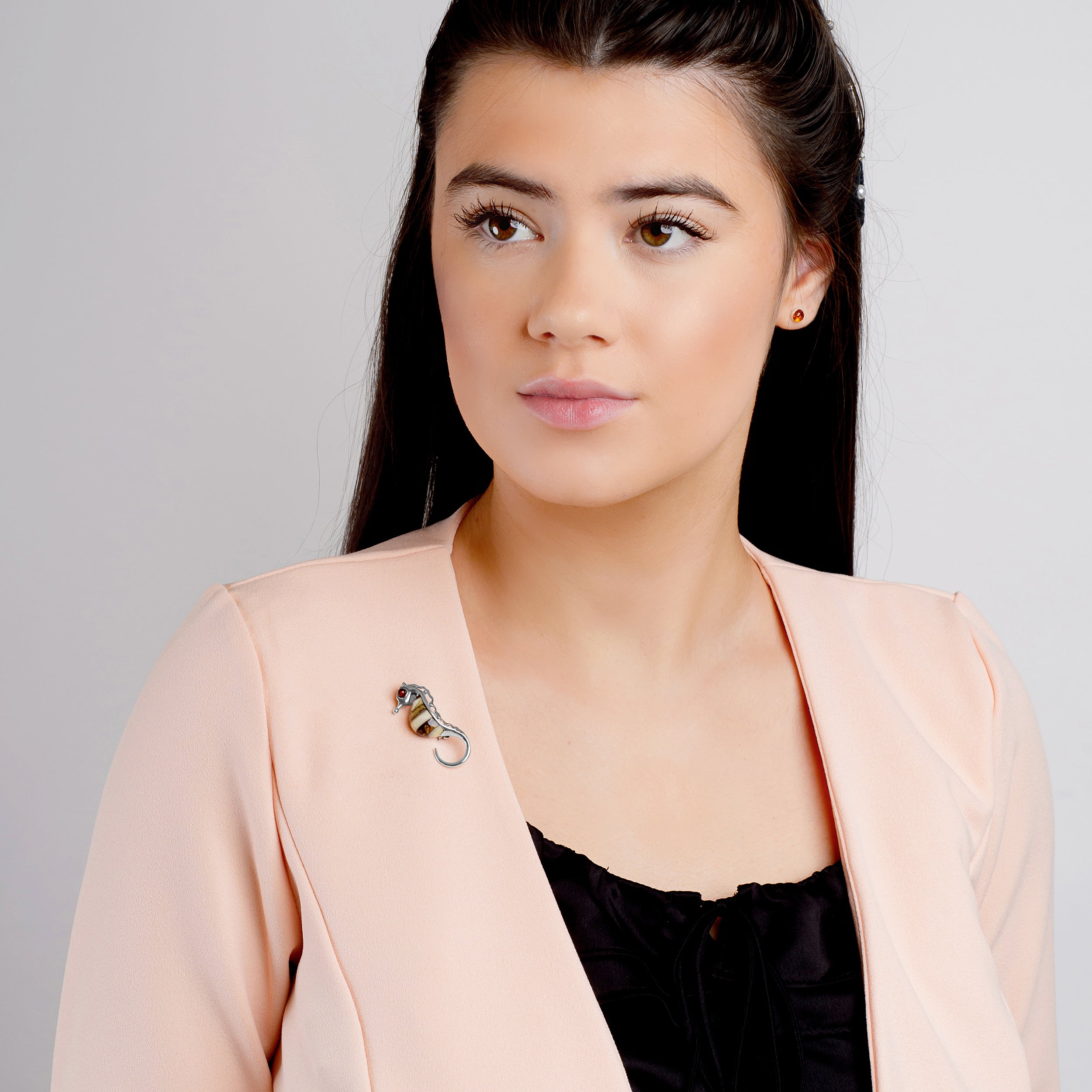 Handcrafted in 925 Silver, this unique brooch is set with genuine Baltic Amber gemstones which creates the special striped effect on the body. With a curled tail, long head and striking Amber stone eye, it is instantly recognisable.