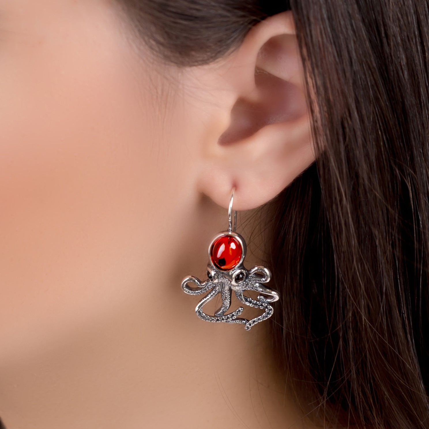 Statement Octopus Earring in Silver and Amber