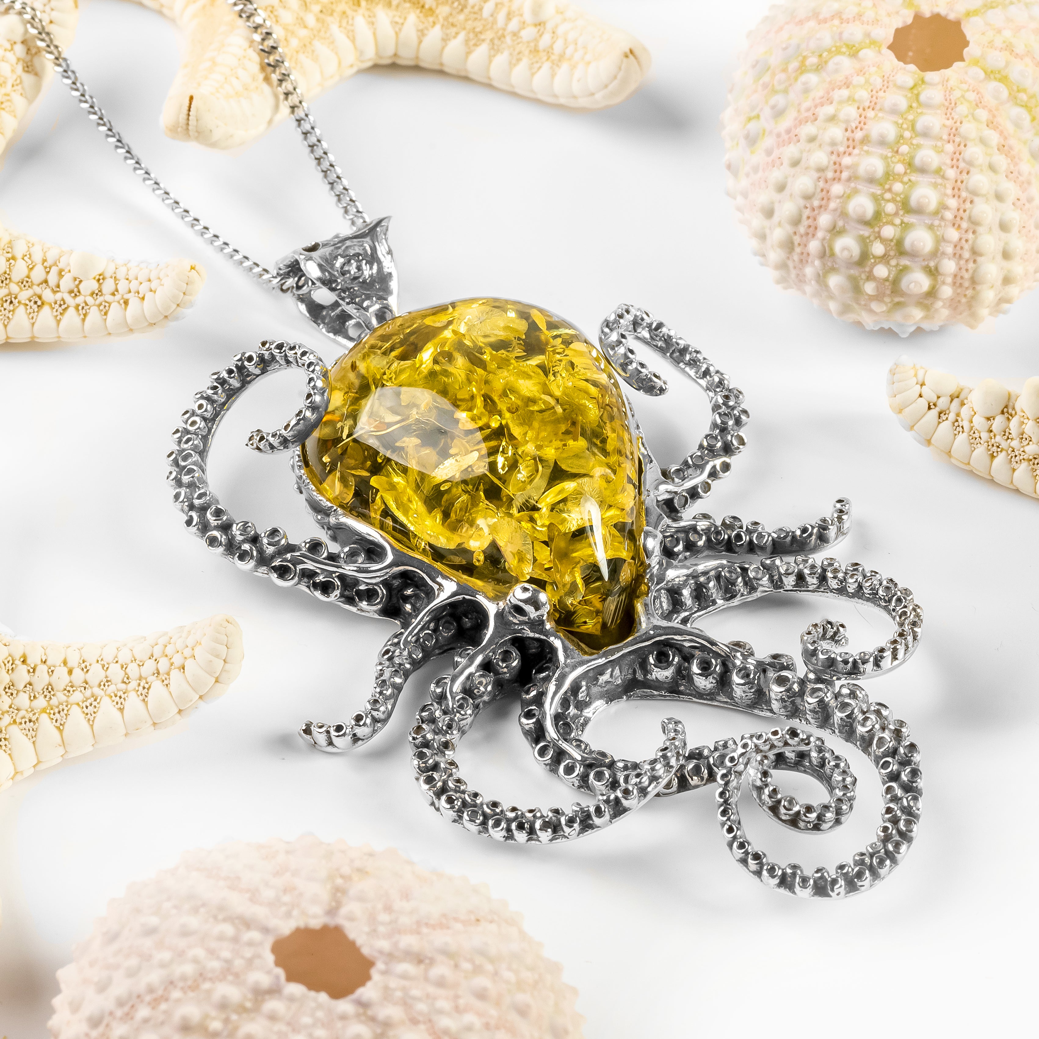 Handcrafted in Sterling Silver and set with a genuine Baltic Green Amber gemstone to represent the bulbous head, it is instantly recognisable. With highly detailed arms complete with suckers and prominent, piecing eyes. This truly is the King of the Sea. Paired with a solid silver chain, it will most certainly turn heads wherever you go.