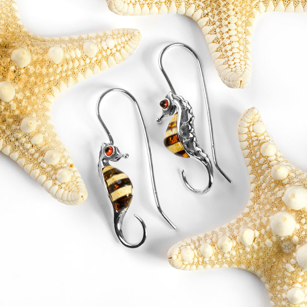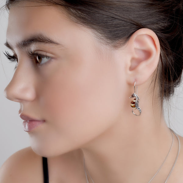 Striped Seahorse Drop Earrings in Silver and Amber