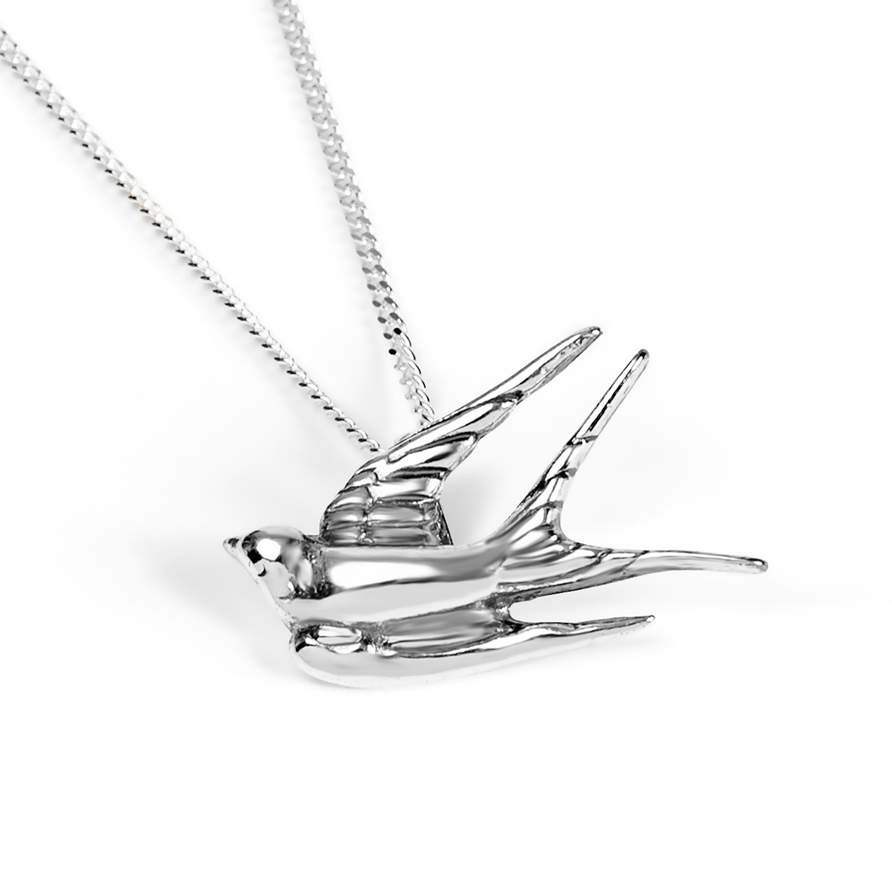 Imitating this bird in flight, our Miniature Silver Swooping Swallow Necklace is perfect for any nature lover.