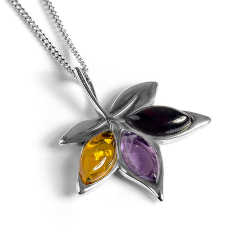 Beech Leaf Necklace in Silver, Amethyst and Amber