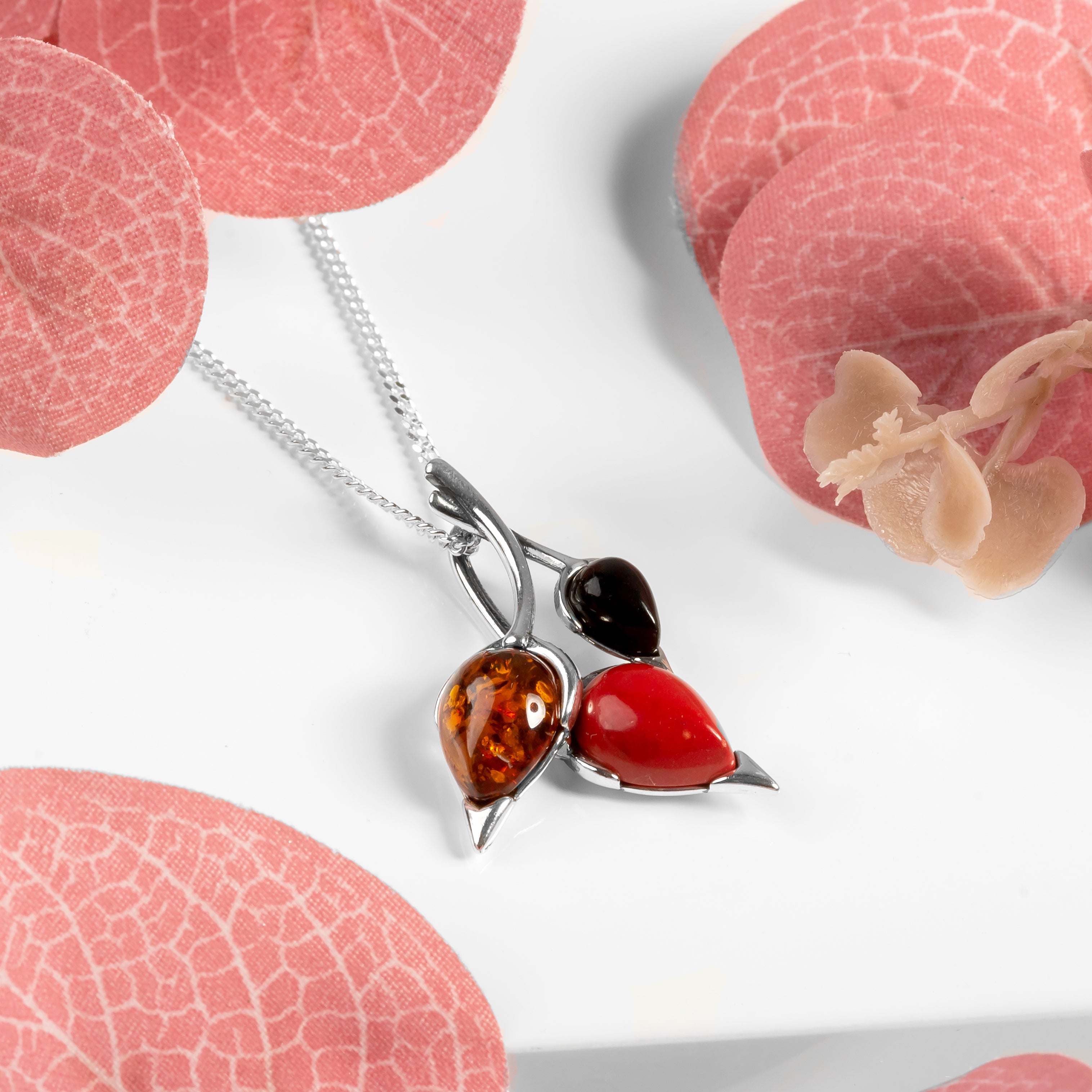 Crafted in 925 silver with 3 carefully cut bright Coral and Baltic Amber stones to represent this recognisable leaf on the tree. The stones have the noticeable 'tip' just as the beech leaf should. Complete with a solid silver chain, this necklace hangs perfectly around the neck.