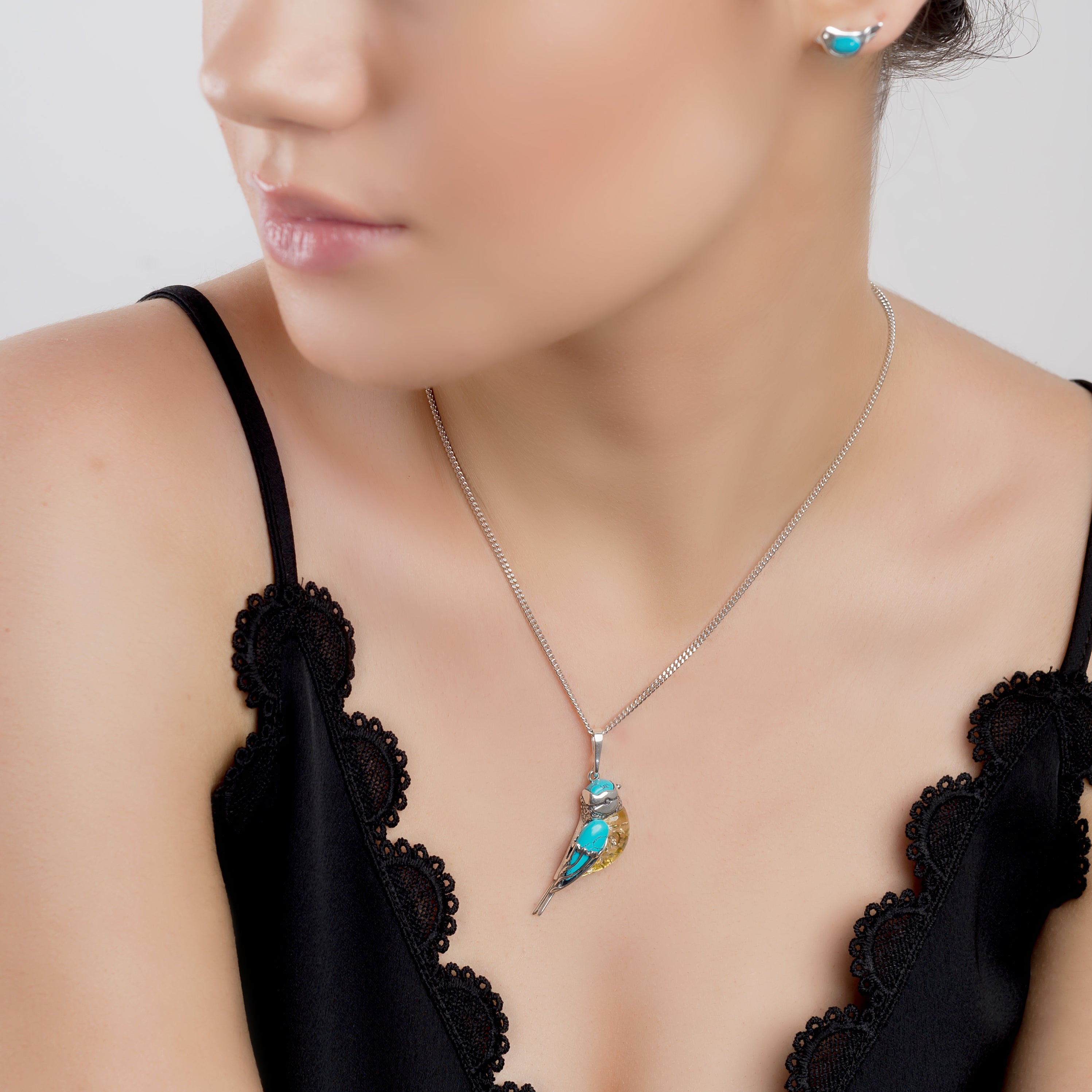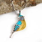Blue Tit Bird Necklace in Silver, Turquoise and Amber