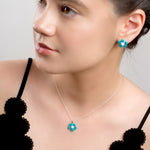 Crafted in 925 silver with 5 individual vibrant Turquoise stones which surround a single genuine Baltic Milky Amber gemstone to create the shape of this popular flower. Complete with a silver chain, this sweet necklace will compliment any outfit for any occasion.