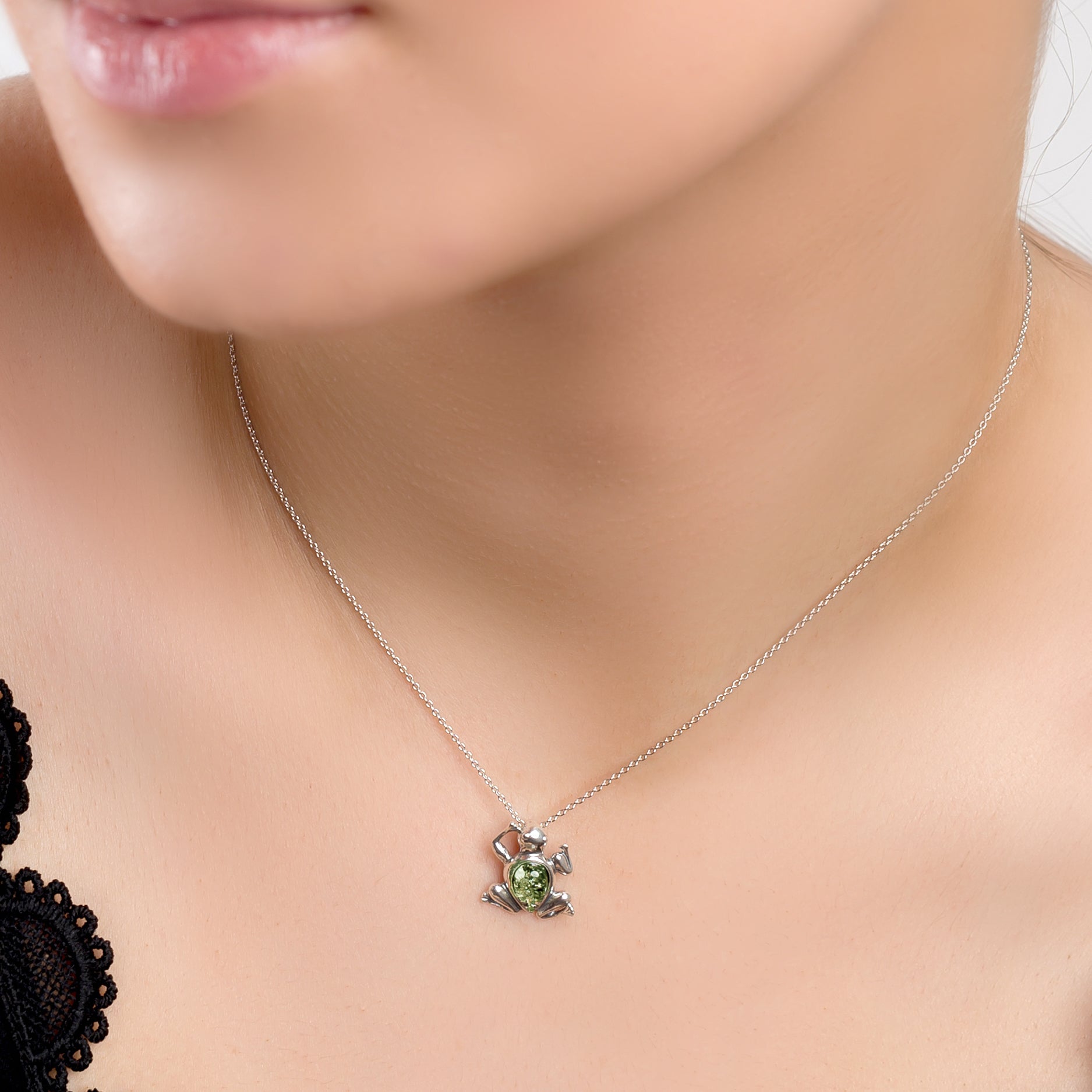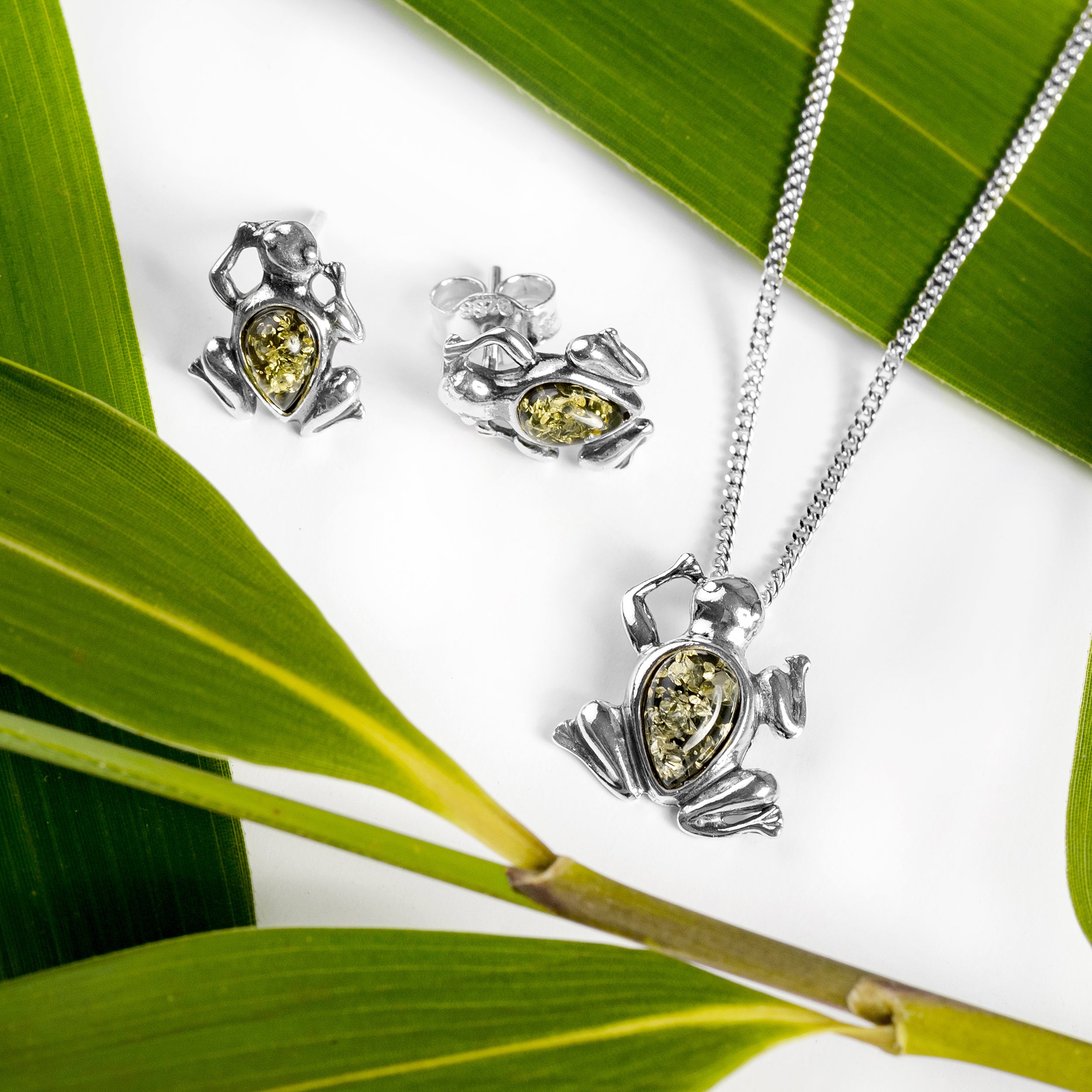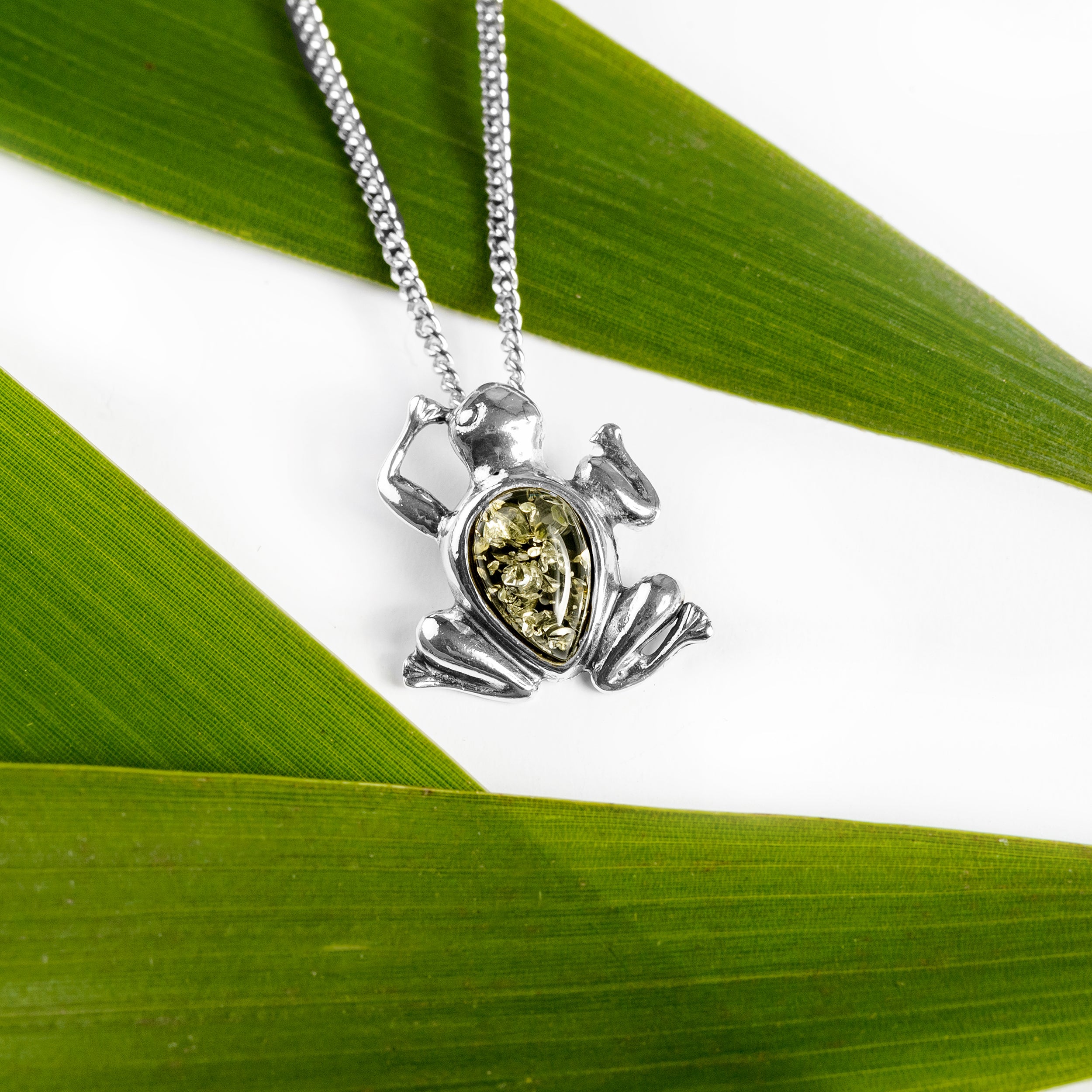 Miniature Frog Necklace in Silver and Green Amber