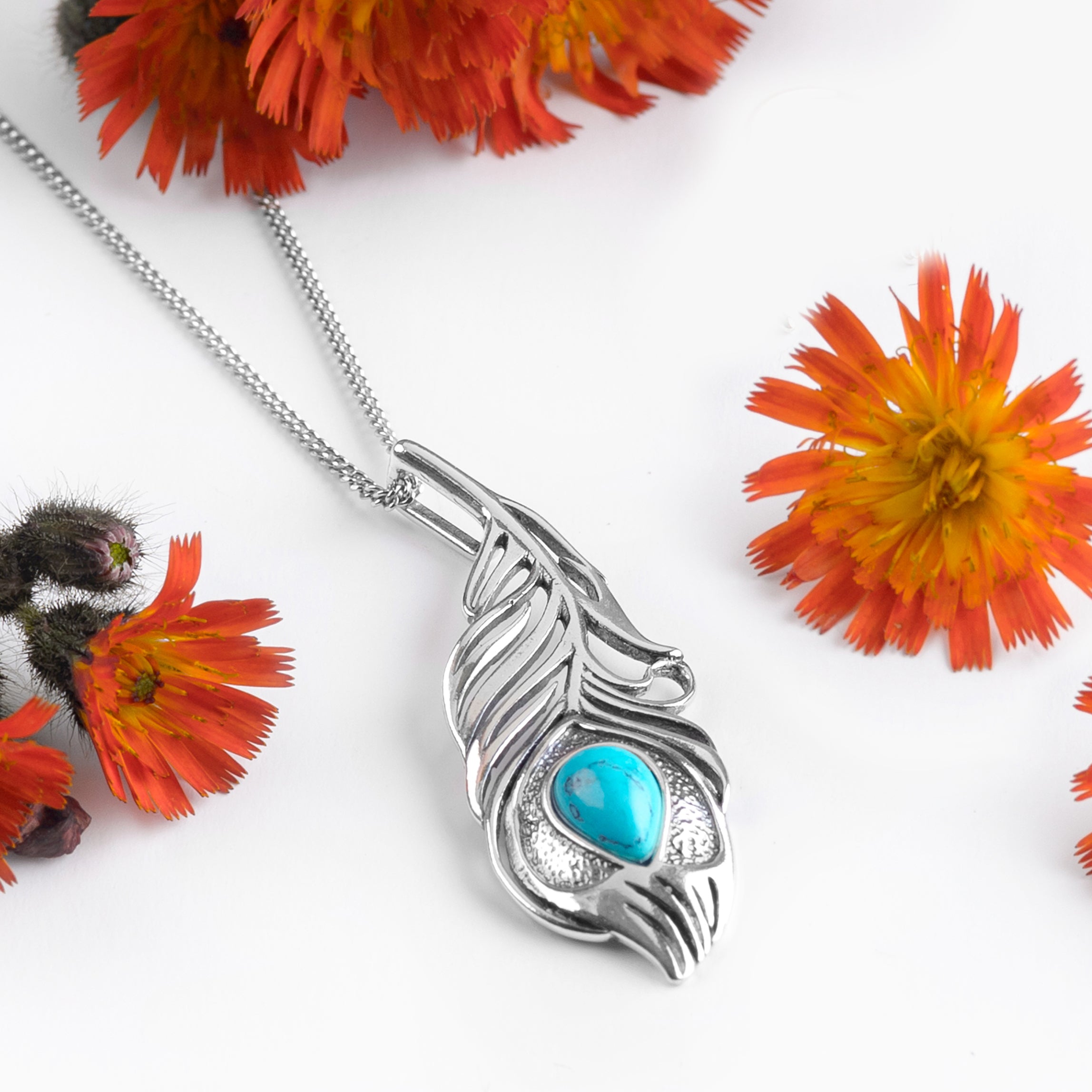 Lovingly crafted in 925 silver and adorned with a teardrop shaped Turquoise stone which has been carefully set into the intricate silver work feather. Complete with a solid silver chain.