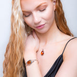 Handcrafted in Sterling Silver the bangle is adorned with a large oval shaped genuine Baltic Amber gemstone at the centre which is surrounded by a pretty vintage finished feather design. The opening is a torque open cuff making it easy to put on and off, but also comfortable to wear all day.