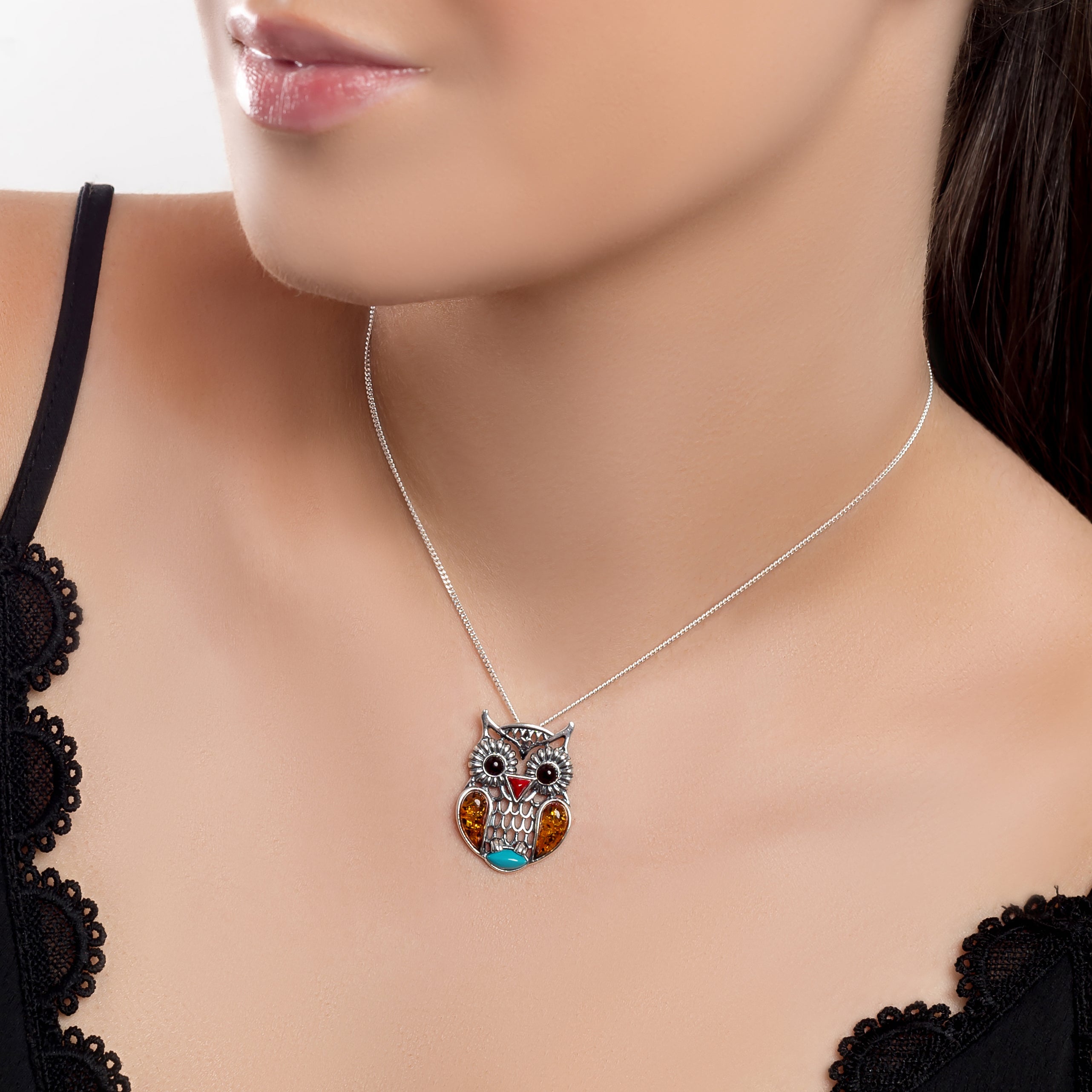 Feathered Owl Necklace in Silver, Turquoise and Amber