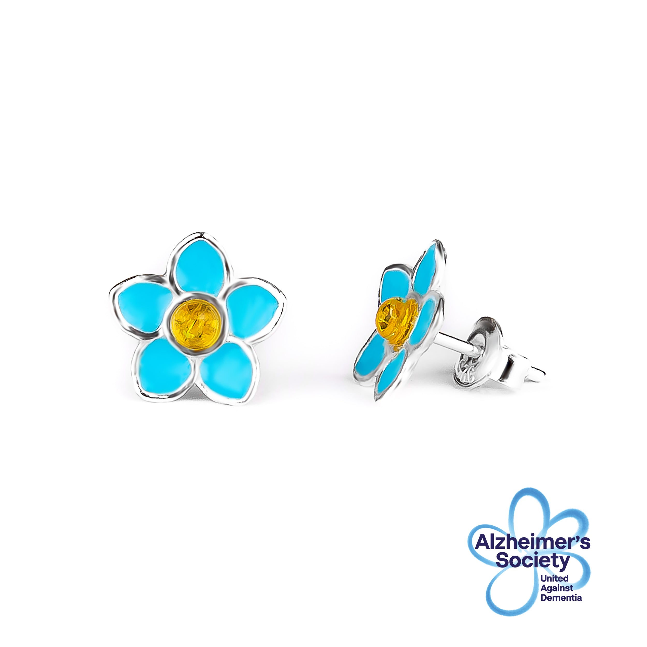 Handpainted Forget Me Not Stud Earrings in Silver and Amber