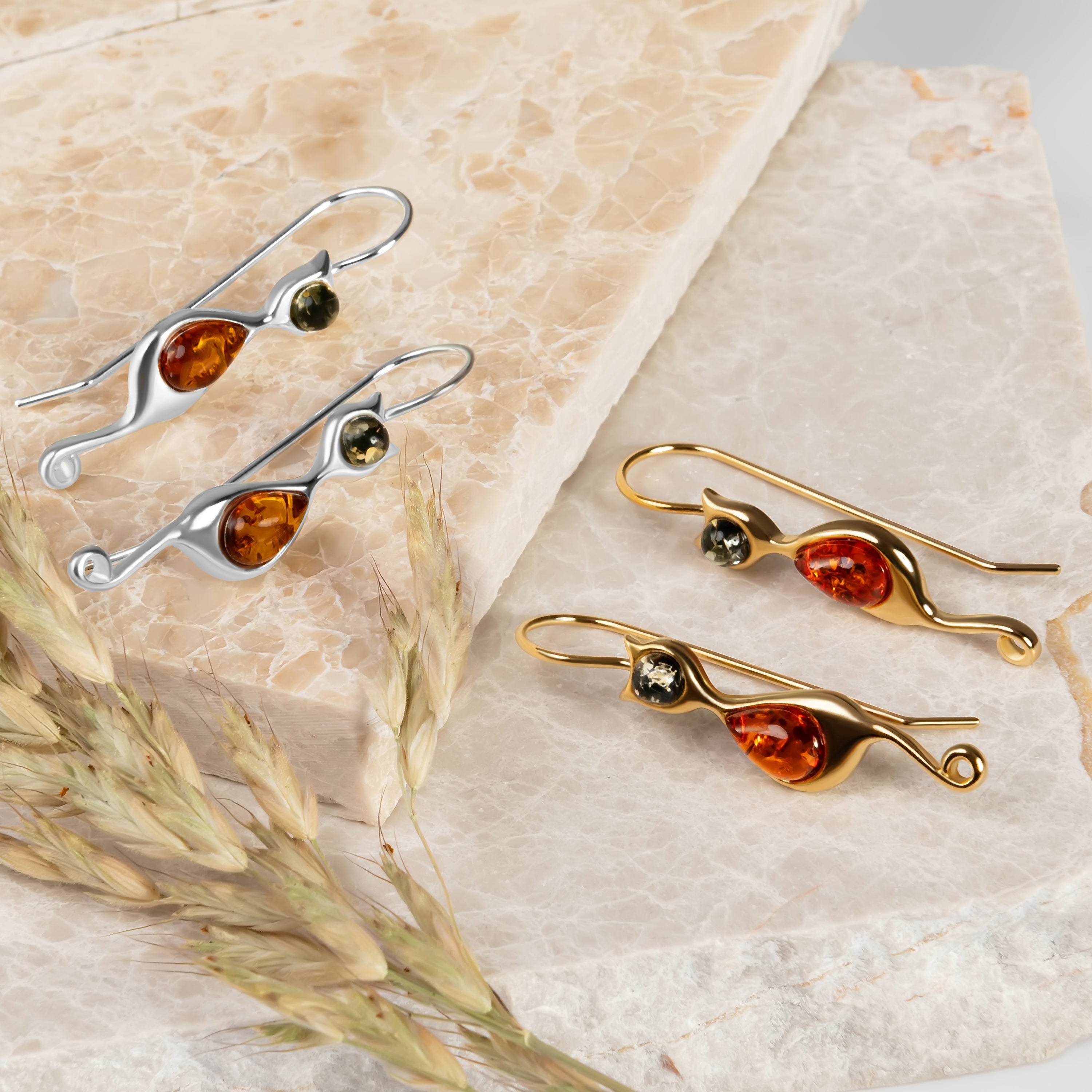 Cat Drop Earrings in Silver with 24ct Gold & Cognac & Green Amber