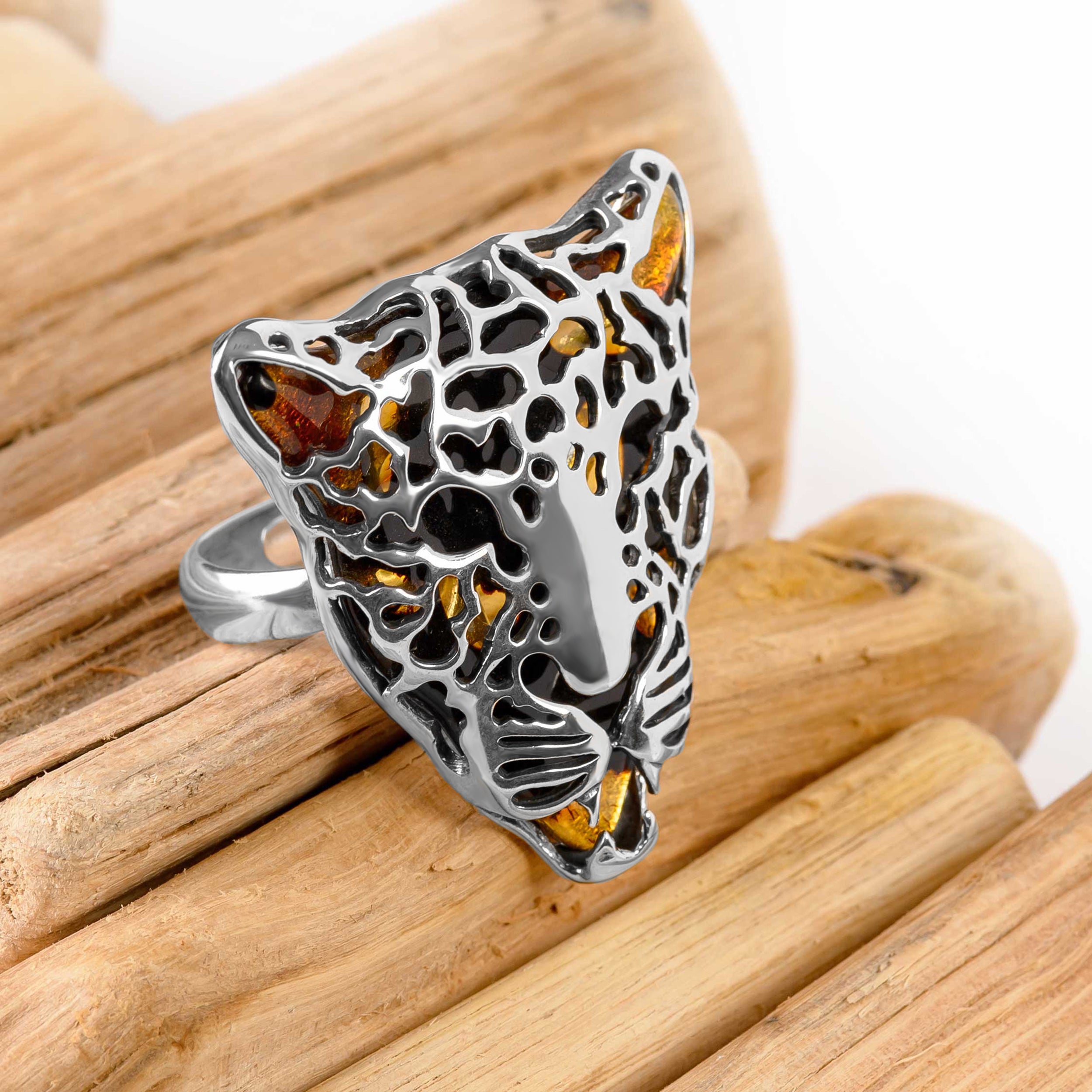 Magnificent Leopard Head Ring in Silver and Amber
