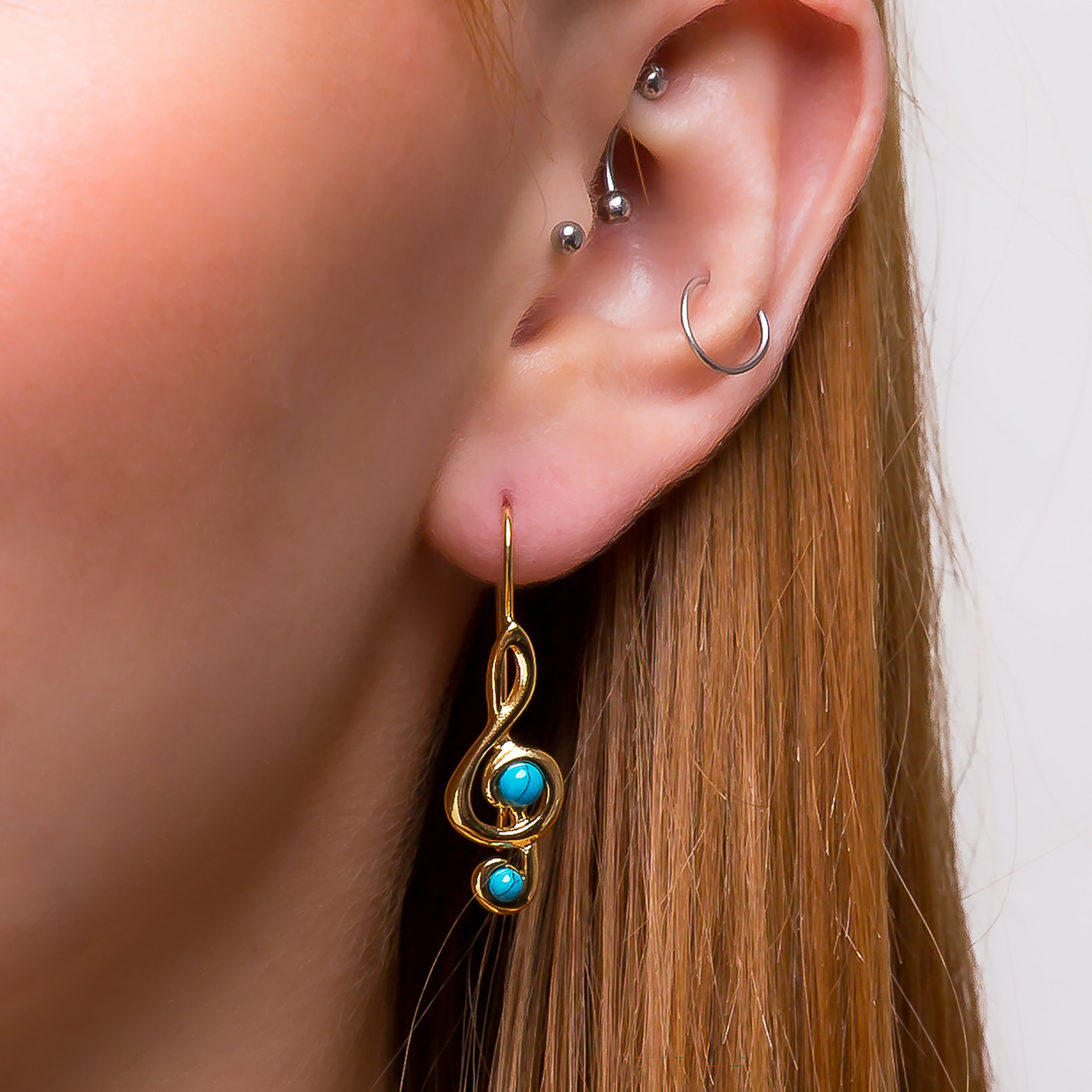 Handcrafted in 925 silver and finished in 24ct Gold plating, each earring is perfectly formed into the classic treble clef shape and adorned with vibrant Turquoise stones to give them a lovely pop of colour. Complete with hook fittings so they will dangle from the ear beautifully.