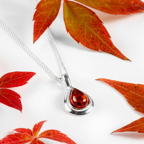 Crafted in a teardrop shape, the genuine Baltic Amber gemstone is set into a 925 Sterling Silver mount. With a solid silver chain, it completes this necklace perfectly to suit every occasion.