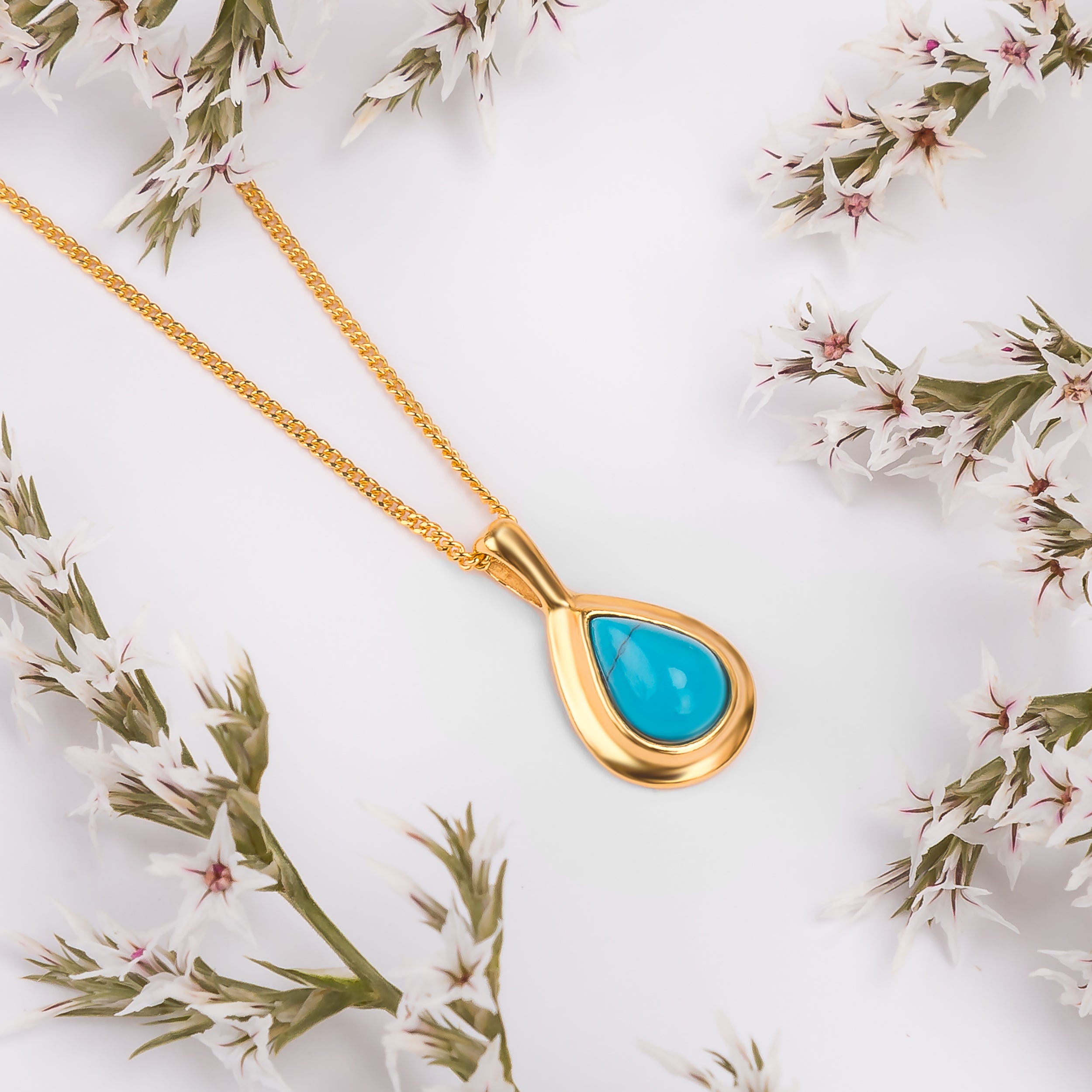 Crafted in a teardrop shape, the Turquoise stone is set into a 925 Sterling Silver which has been plated in 24ct Gold mount. With a solid silver chain, it completes this necklace perfectly to suit every occasion.