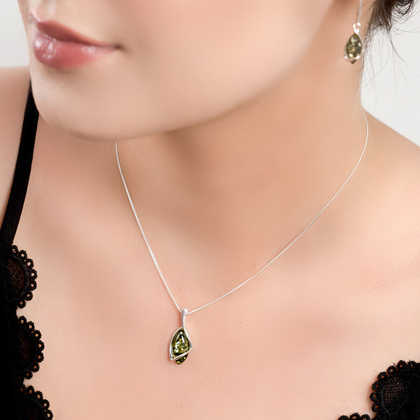 Add a classic touch to your accessories with our Silver and Green Amber Twist Necklace.