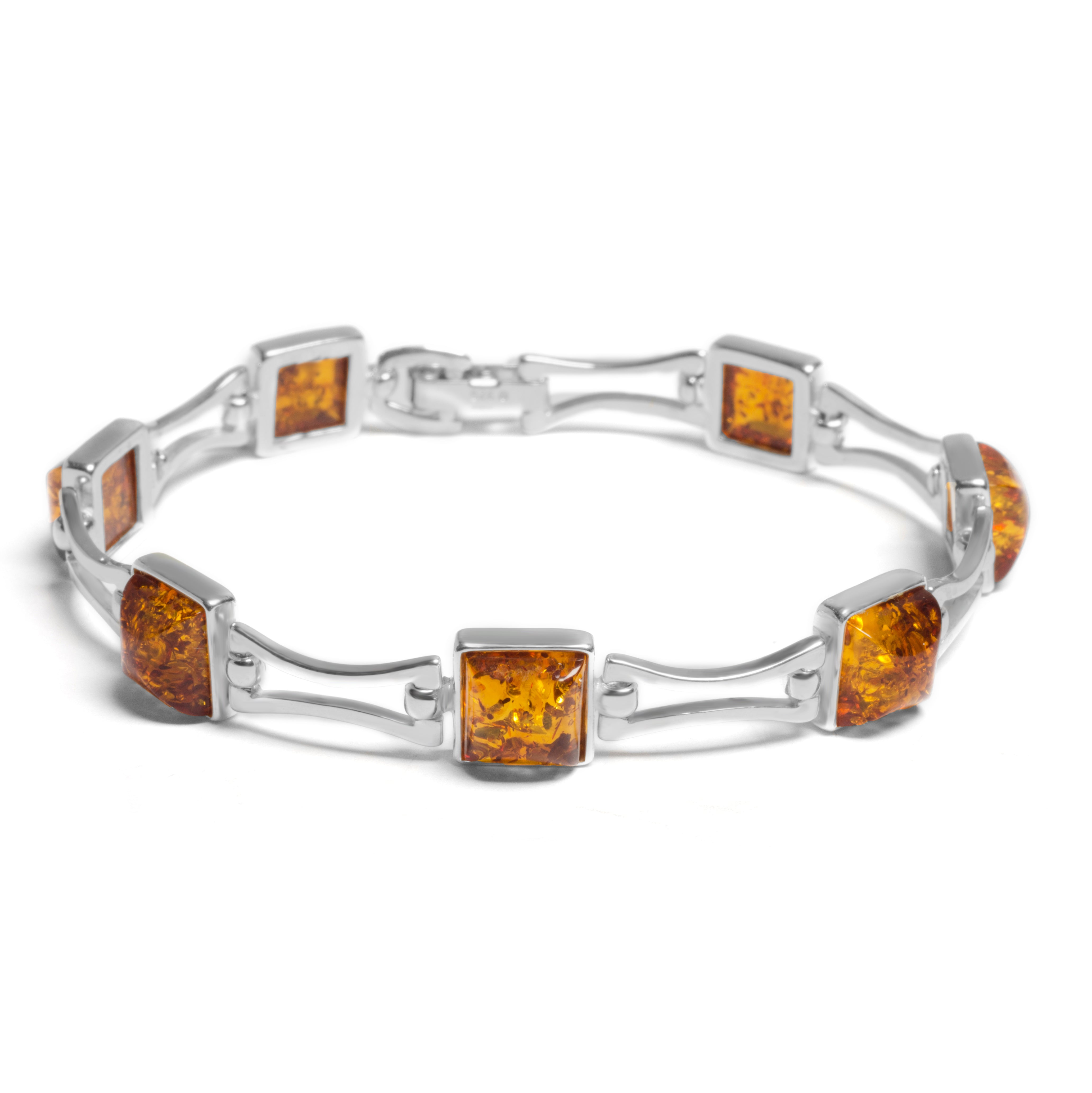 With 7 single square cut genuine Baltic Amber gemstones linked by solid 925 silver bars. Beautifully crafted and elegant.