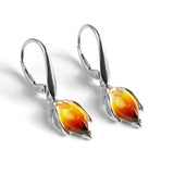 Crafted in 925 silver, each earring is adorned with a marquise shaped genuine Baltic Amber gemstone which has been heat treated to create a two-tone colour. With a pretty solid silver flower bud casing making them both delicate and stylish. Finished with secure clip hook fittings, they will dangle elegantly from the earlobe.