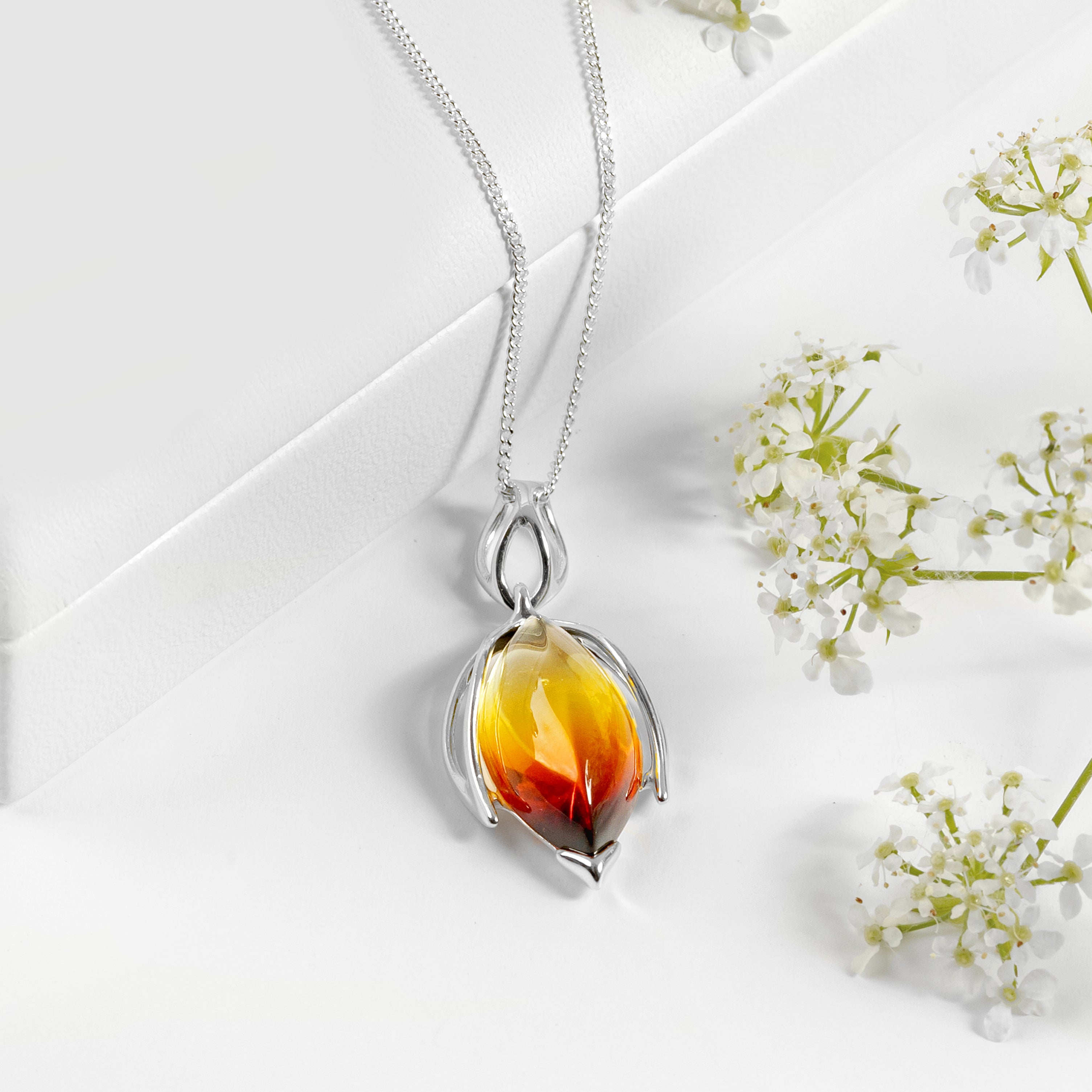 Handcrafted 925 silver this pendant is adorned with a single marquise shaped genuine Baltic Amber gemstone which has been heat treated to create the two tone colour. Set into a silver flower bud shape mount, it is both delicate and stylish. Complete with a solid silver chain.