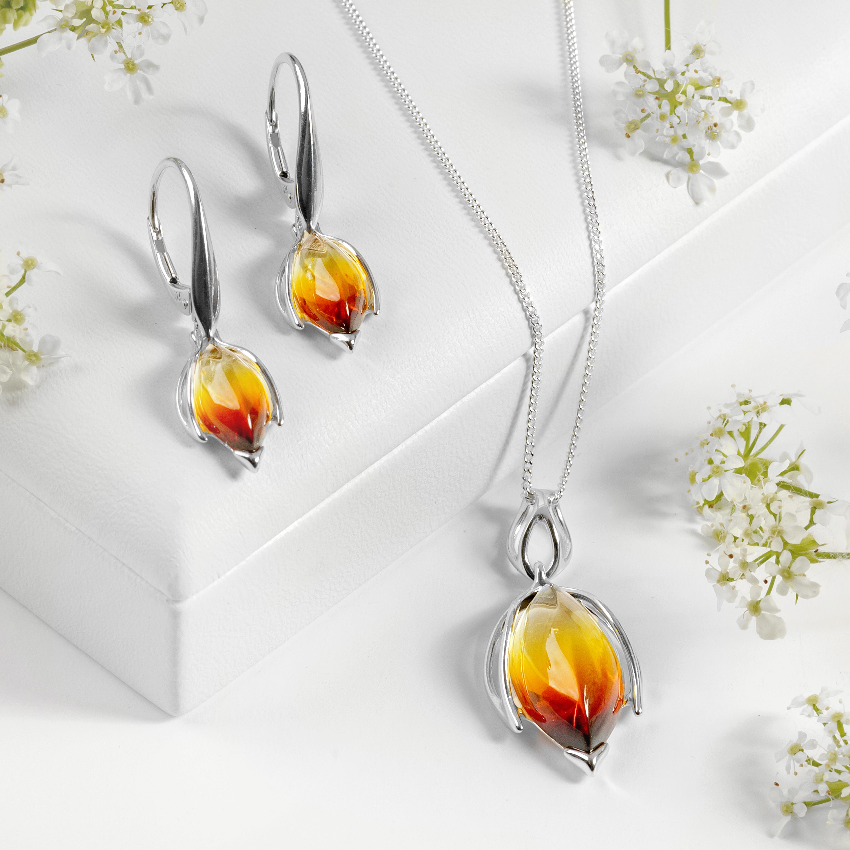 Capturing the beauty of all sunsets, this necklace will make wonderful gift for any lover of Amber or unusual gemstones. Be sure to pair with the matching Earrings for the ultimate WOW factor.