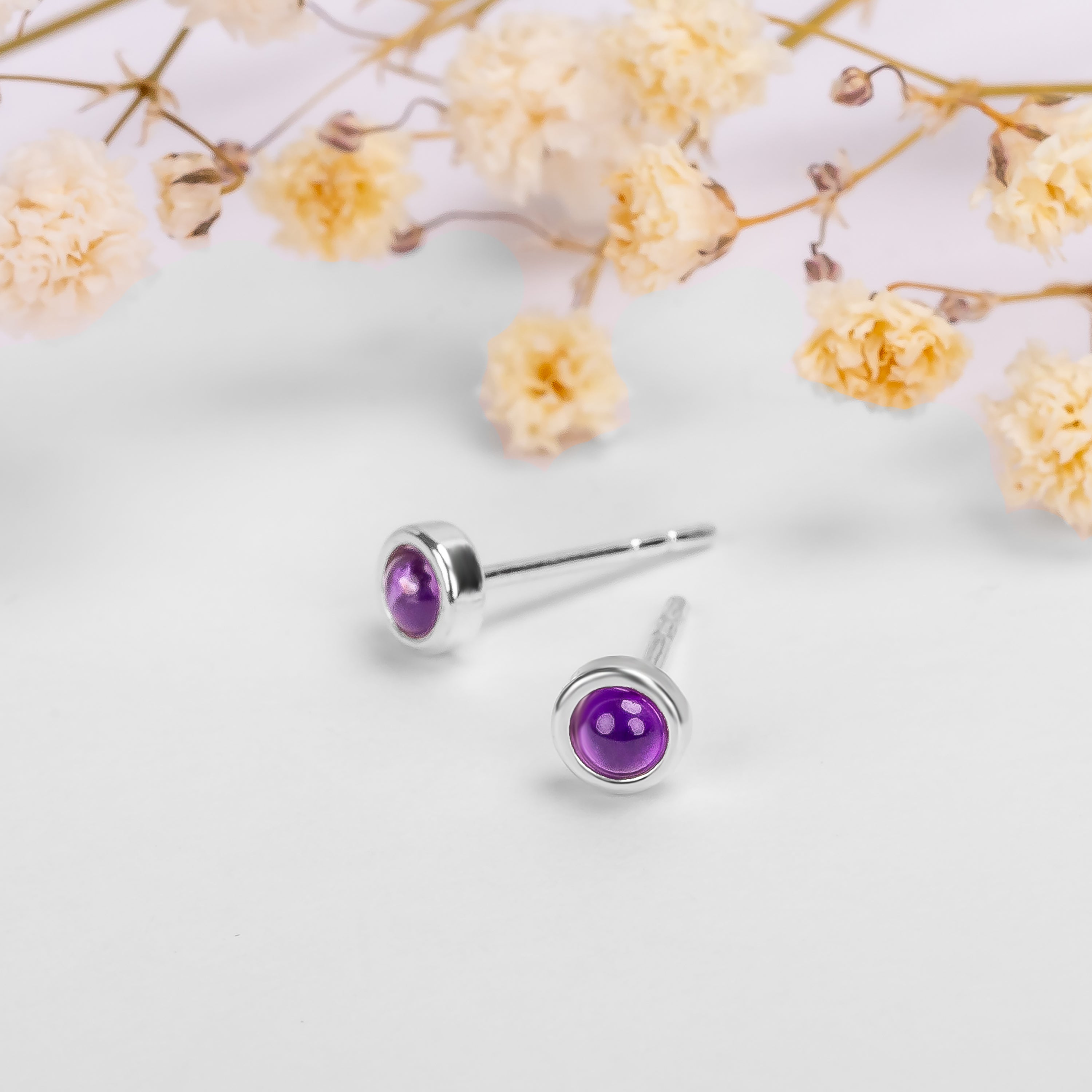 Small Round Stud Earrings in Silver and Amethyst