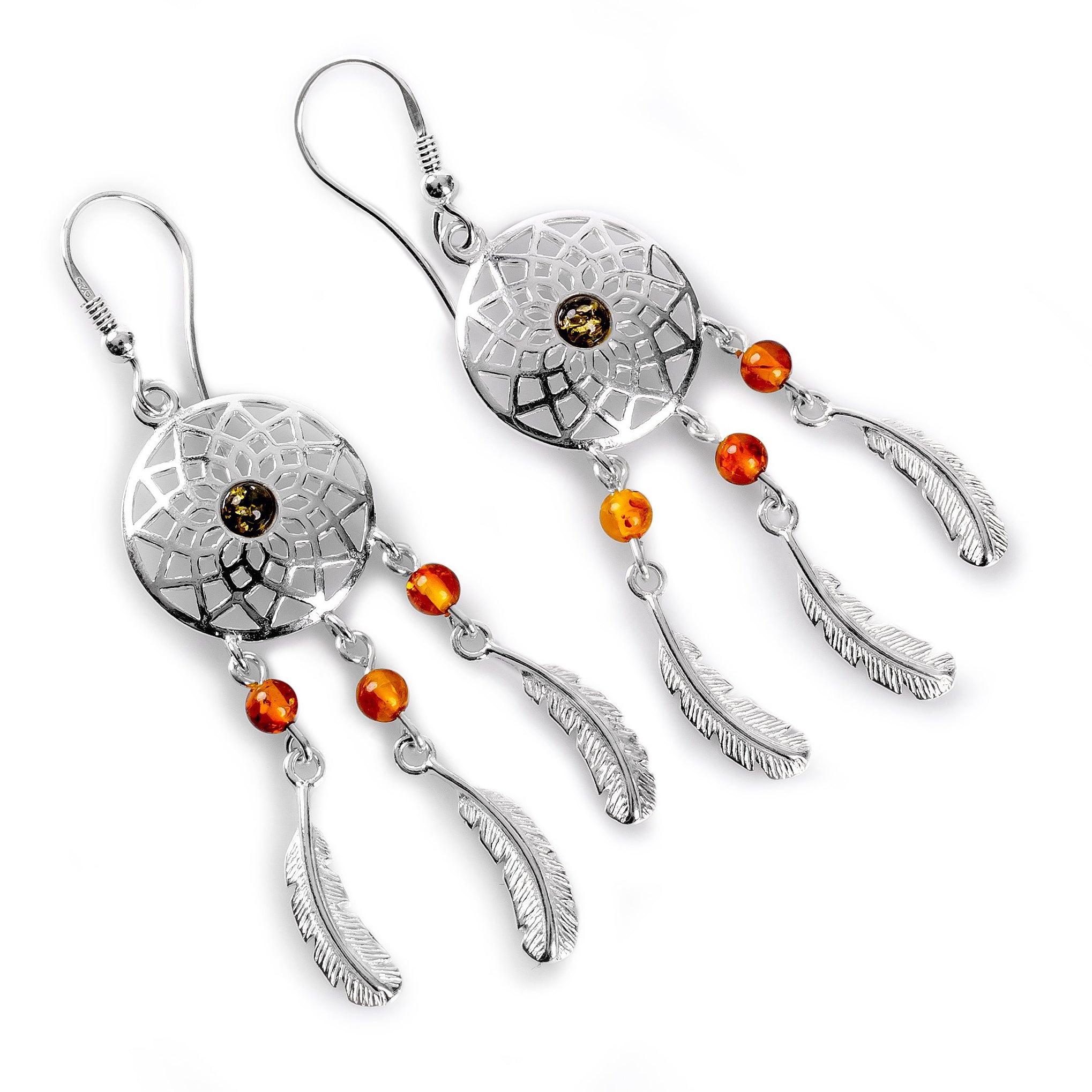 Lovingly crafted in 925 Sterling Silver each earring showcases an intricate webbed core with single genuine Green Amber gemstone at the centre. Finished with 3 hanging individual delicate feathers adorned with warm Cognac Amber gemstone beads. Complete with a solid silver chain hooks, they will hang perfectly from the ear.