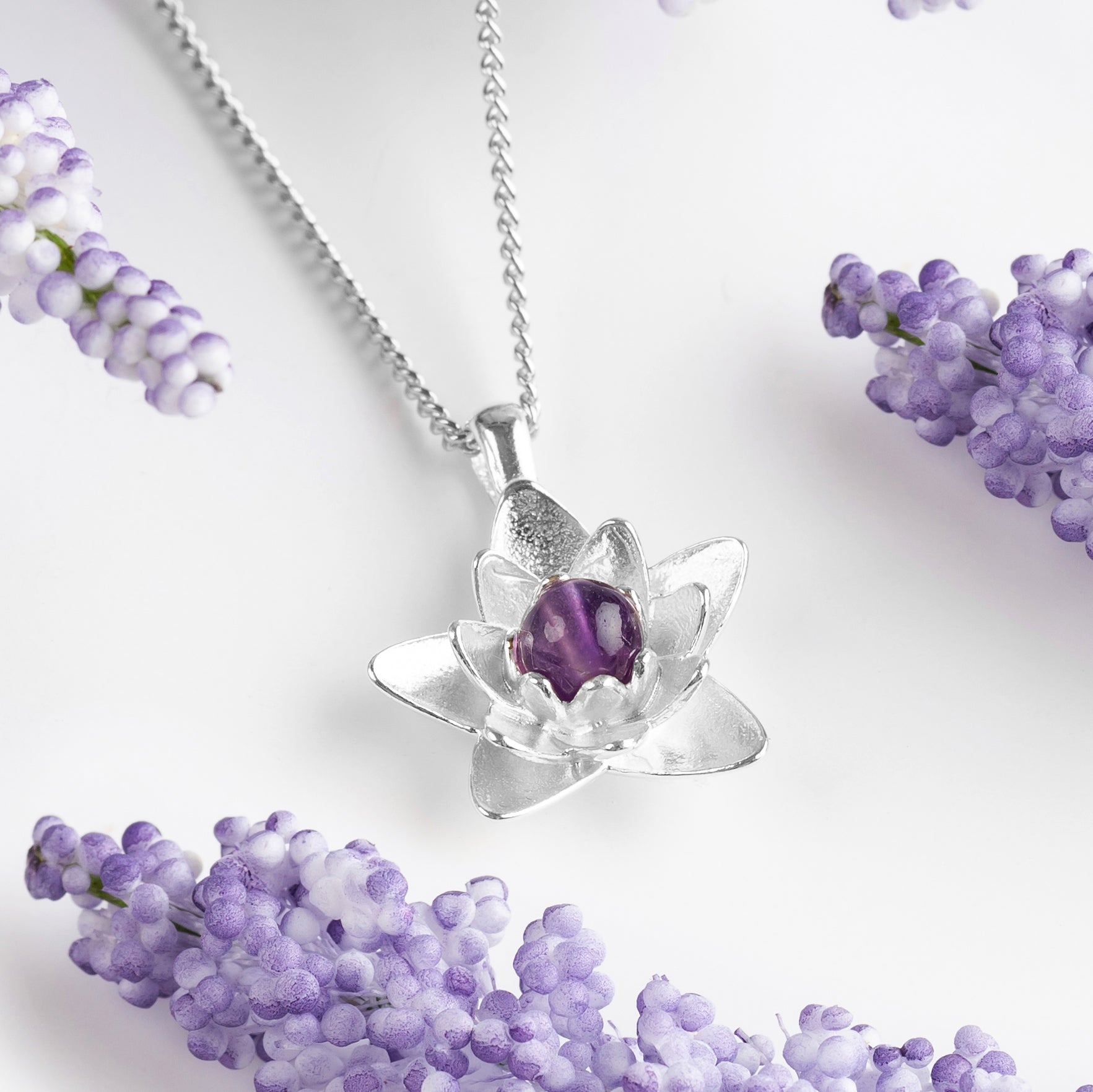 A perfectly formed Silver and Amethyst Lotus Flower Necklace will make a special keepsake.