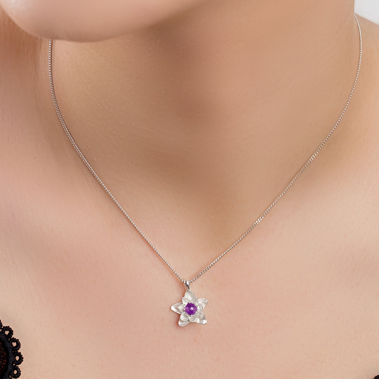 Carefully crafted in 925 silver with a single natural Amethyst gemstone at the centre of the flower. Finished with delicate frosted silver pointed petals to bring it to life. Complete with a silver chain, it is perfect for all ages.
